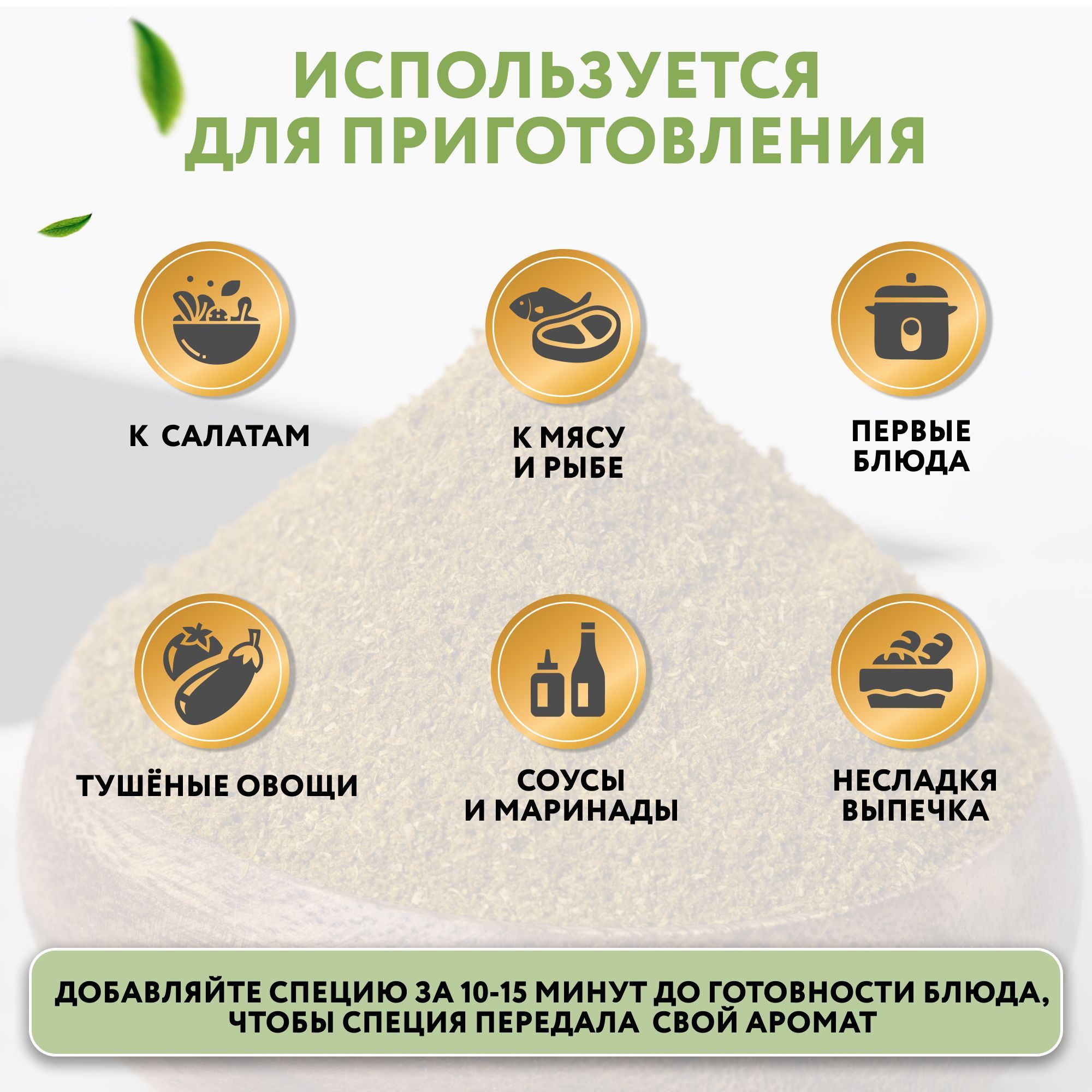 Назначение приправы: Для барбекю, Для блюд из картофеля, Для блюд на гриле, Для жаркого, Для копчения, Для курицы, Для мясных блюд, Для овощей, Для плова, Для птицы, Для риса, макарон и пиццы, Для рыбы и морепродуктов, Для салатов, Для свинины, Для соусов, Для супов, Для тефтелей, Универсальная