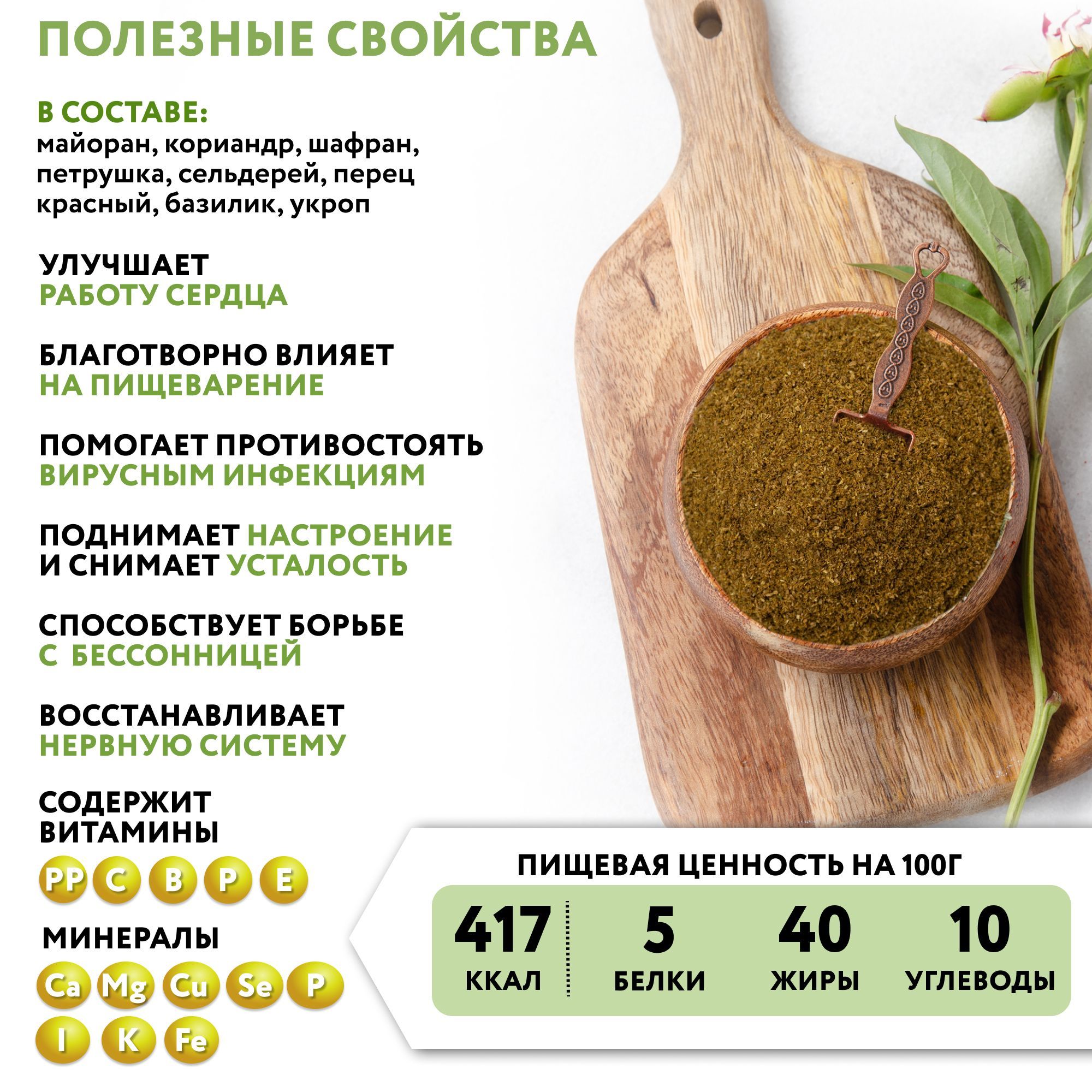 Состав: майоран, кориандр, шафран, петрушка, сельдерей, перец красный, базилик, укроп