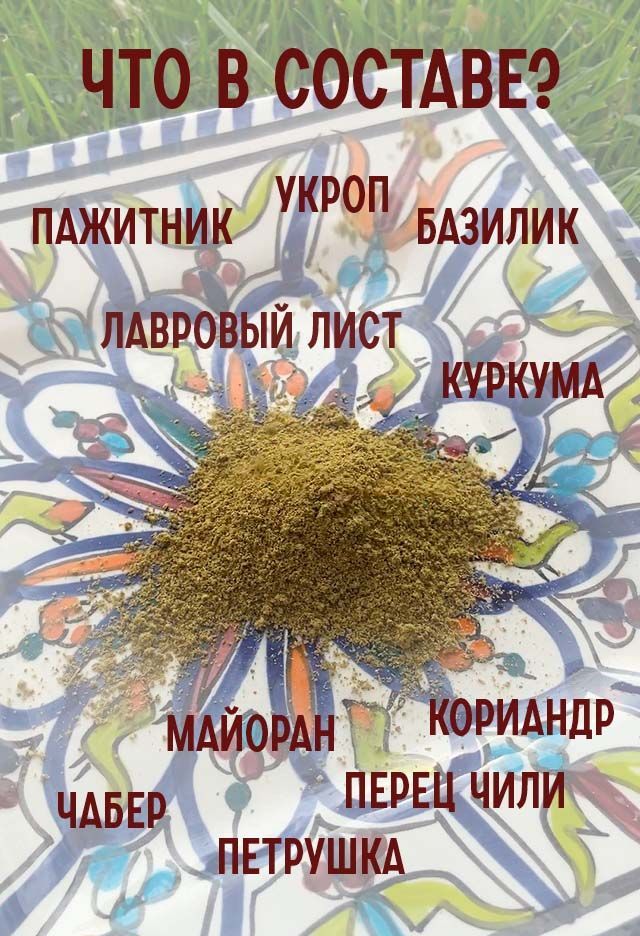 Укроп Зелень Молотая (Anethum, Dill); Пажитник Молотый Шамбала ( Trigonélla foenum-graecum); Лавровый Лист Молотый (Лавр, Laurus); Базилик (Ocimum, basilius); Куркума (Curcuma); Майоран Молотый (Бардакуш, Мардакуш, Marjoram, Origanum Majorana); Чабер Молотый (Satureja, Savory); Петрушка Зелень Молотая (Petroselinum, Parsley, Petrushka); Перец чили, Красный Острый Перец (syn. Capsicum frutescens); Кориандр Молотый (лат. Coriandrum sativum L.).
