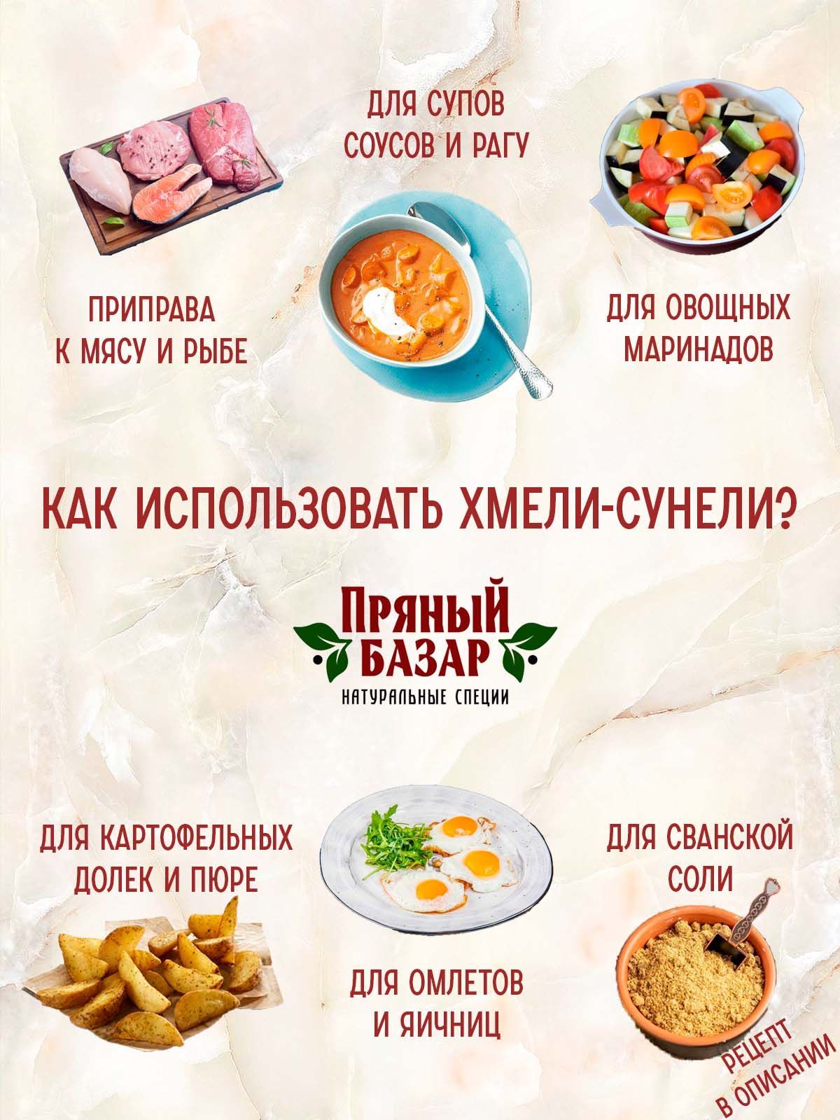 Описание: Текстовое описание изображенияТекст при отключенной в браузере загрузке изображенийПриправа Хмели-сунели молотаяОткройте для себя смесь экзотических специй - хмели-сунели! Нежные оттенки укропа, аромат пажитника, пряный майоран, лавровый лист, крепкий апельсиновый оттенок куркумы и пикантный перец чили - это все, что вам нужно для приготовления оригинальных и вкусных блюд.