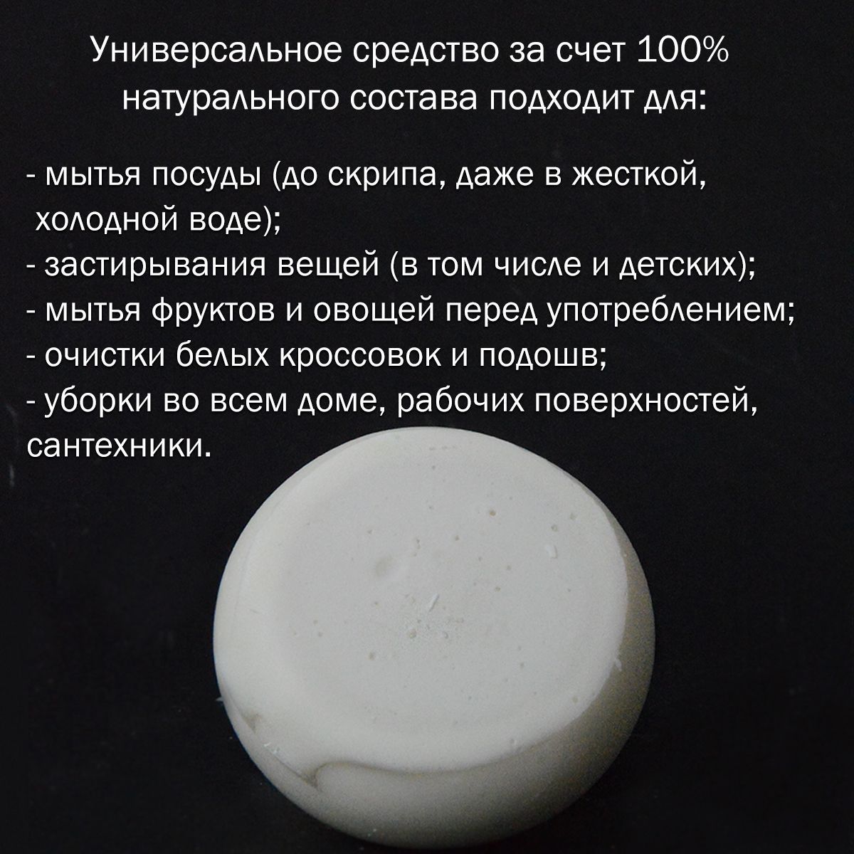 Описание: Универсальное средство за счет 100% натурального состава подходит для мытья посуды (до скрипа, даже в жесткой, холодной воде), застирывания вещей (в том числе и детских), мытья фруктов и овощей перед употреблением (рекомендуем ввести эту полезную привычку), очистки обуви, в том числе белой, уборки во всем доме. В комплекте деревянная мыльница со стоком воды, чтобы мыло не раскисало при использовании.