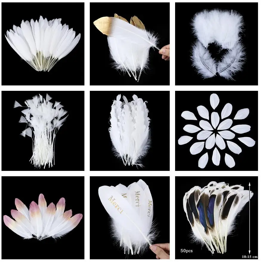 Натуральные белые перья для рукоделия, сделай сам, изготовление украшений, головной убор, гусь, Страус, индейка, шлейфы, свадебное украшение для дома, 10/20/50 шт.