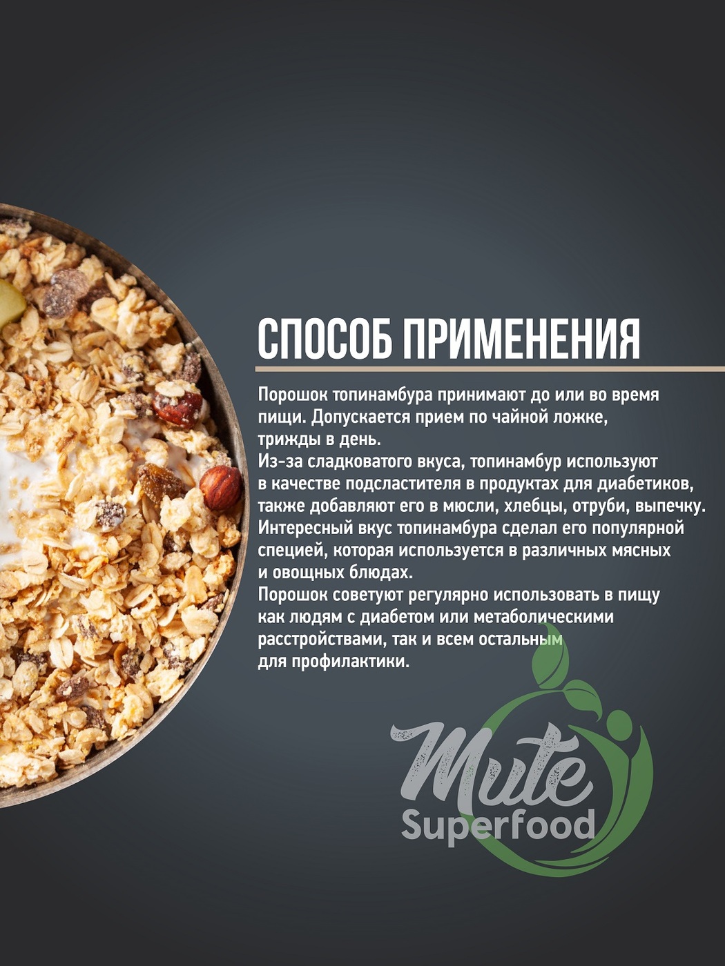Описание: Топинамбур это суперфуд, известен прежде всего содержанием в нем инулина, природного полисахарида и пребиотика Инулин работает в 2 направлениях: 1. он является питательной средой для полезных бактерий в нашем организме, нормализуя микрофлору кишечника. Это влияет на красоту кожи, и на здоровье желудочно-кишечного тракта. 2. Инулин контролирует уровень сахара в крови, что особенно важно при нарушении обмена веществ. Также в Топинамбуре содержится целый ряд витаминов и минералов (8% кремния на каждый 100 г.), калий, железо, фосфор, магний, кальций, цинк, витамины группы В и С. Порошок топинамбура в воде не растворяется, а становится мягче и темнеет, приобретая темно-коричневый цвет.
