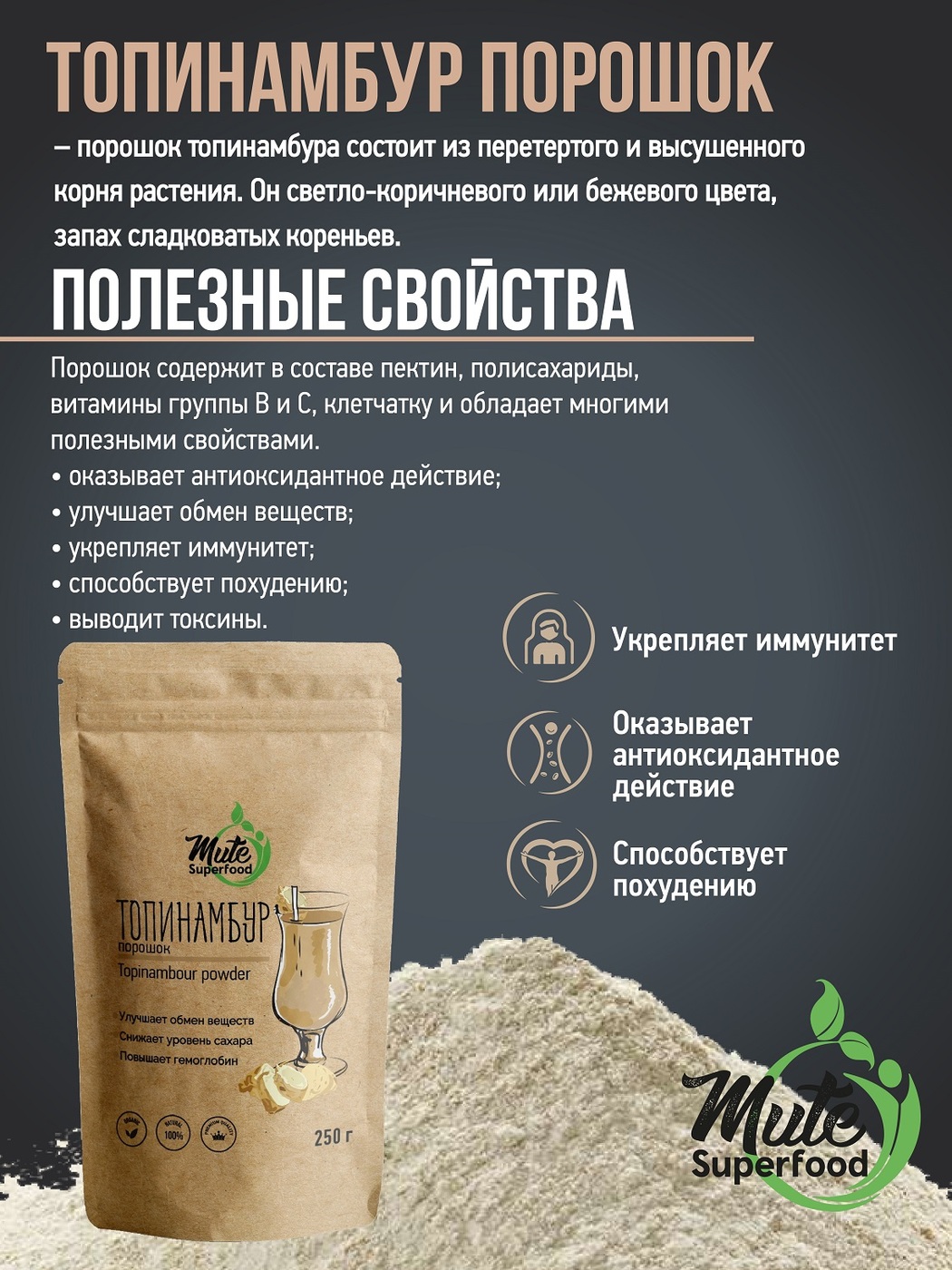 Натуральный Порошок Топинамбура (Topinambour powder) MUTE SUPERFOOD, 250 г. Топинамбур измельченный, Нормализует микрофлору кишечника