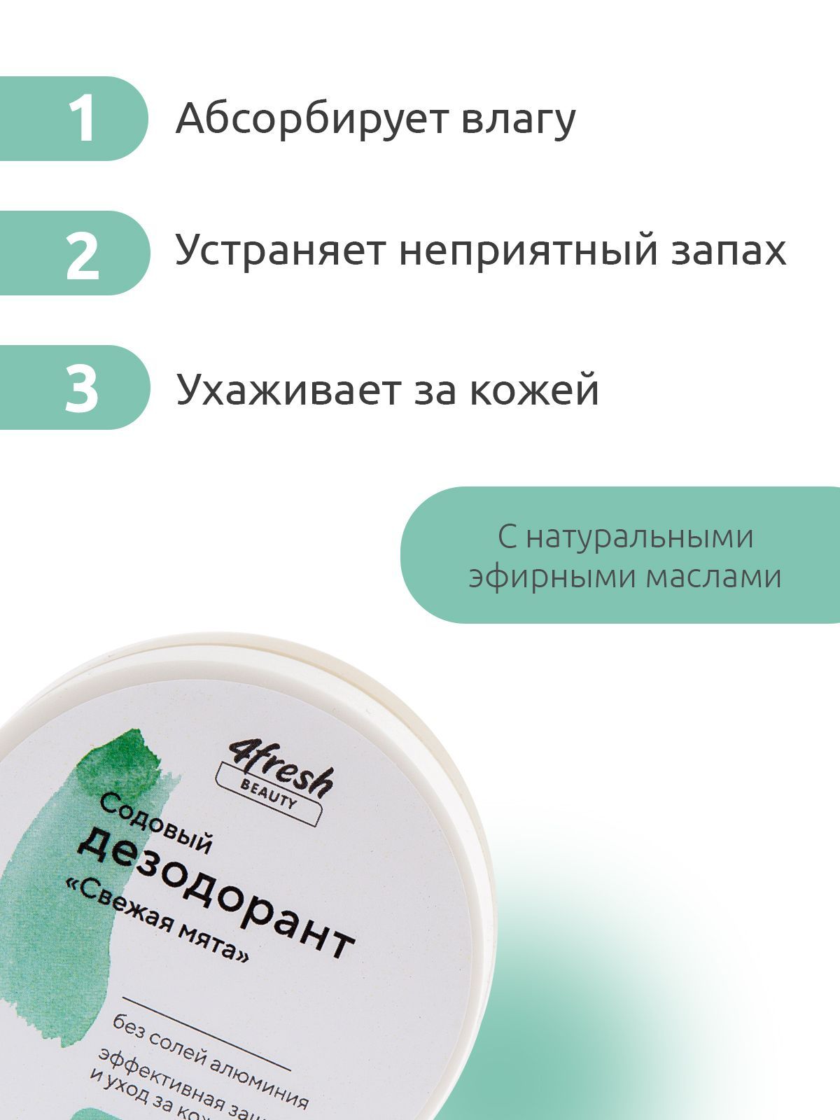 Описание: Содовый дезодорант "Свежая мята"Натуральный дезодорант без алюминия и парабенов 4fresh BEAUTY устраняет неприятный запах и дарит ощущение комфорта и свежести в течение всего дня.