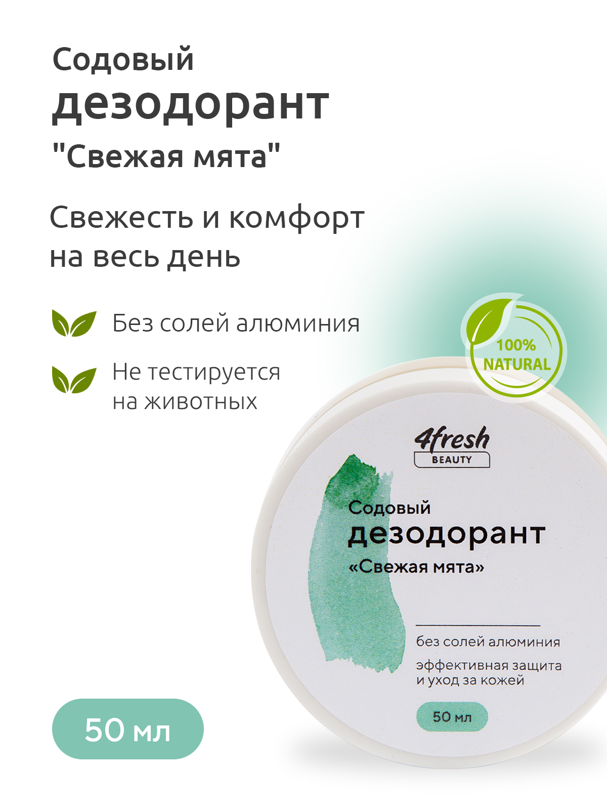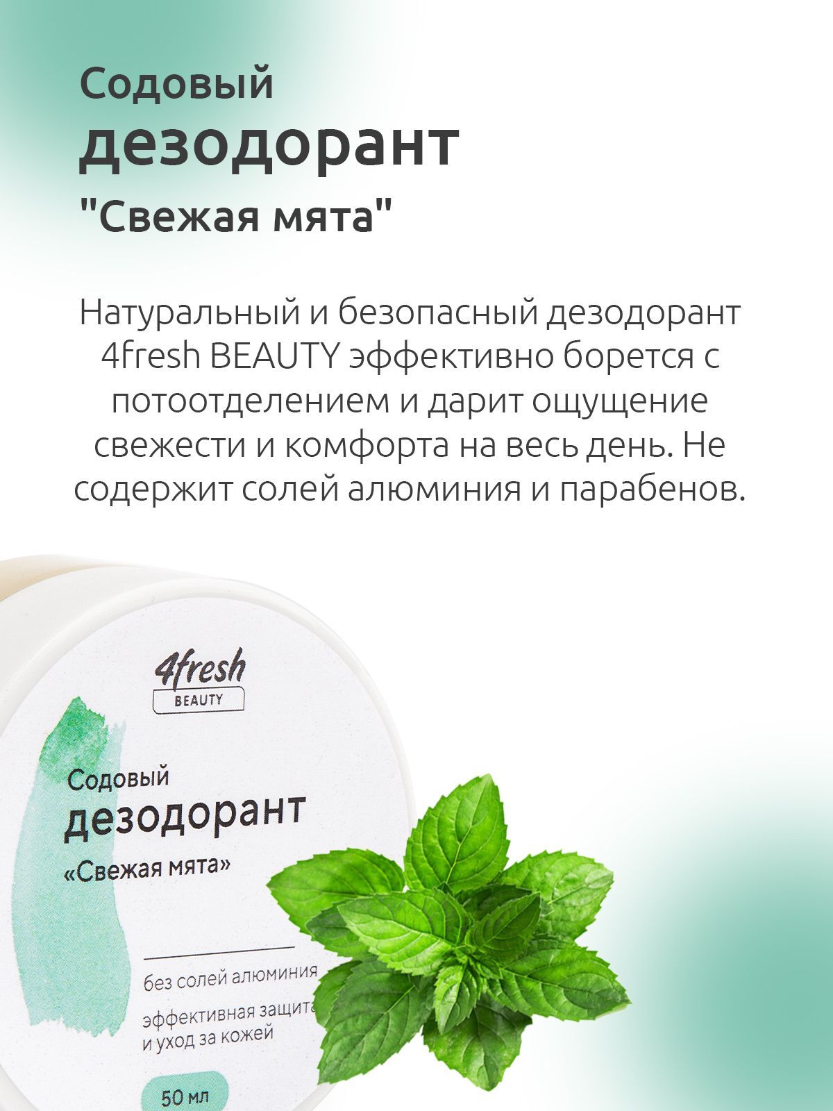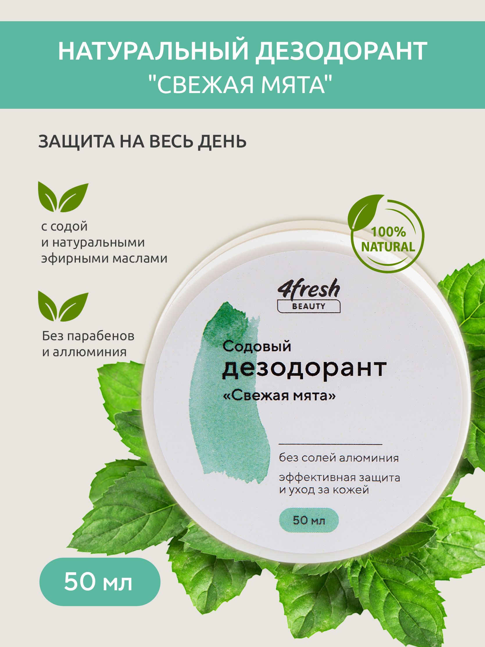 Натуральный содовый дезодорант без алюминия "Свежая мята" 4fresh BEAUTY, унисекс, 50г