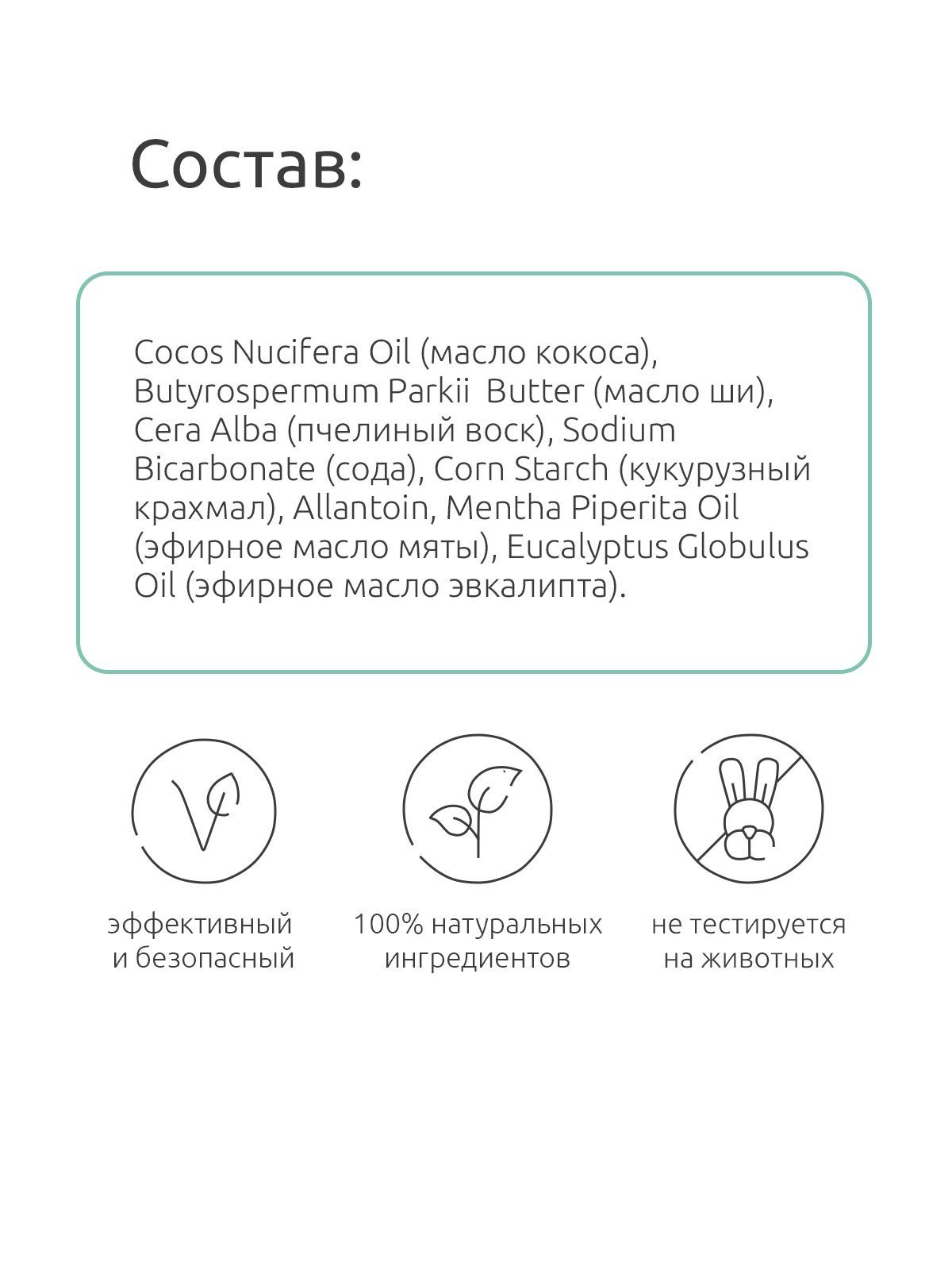 Cocos Nucifera Oil (масло кокоса), Butyrospermum Parkii Butter (масло ши), Cera Alba (пчелиный воск), Sodium Bicarbonate (сода), Corn Starch (кукурузный крахмал), Allantoin, Mentha Piperita Oil (эфирное масло мяты), Eucalyptus Globulus Oil (эфирное масло эвкалипта).