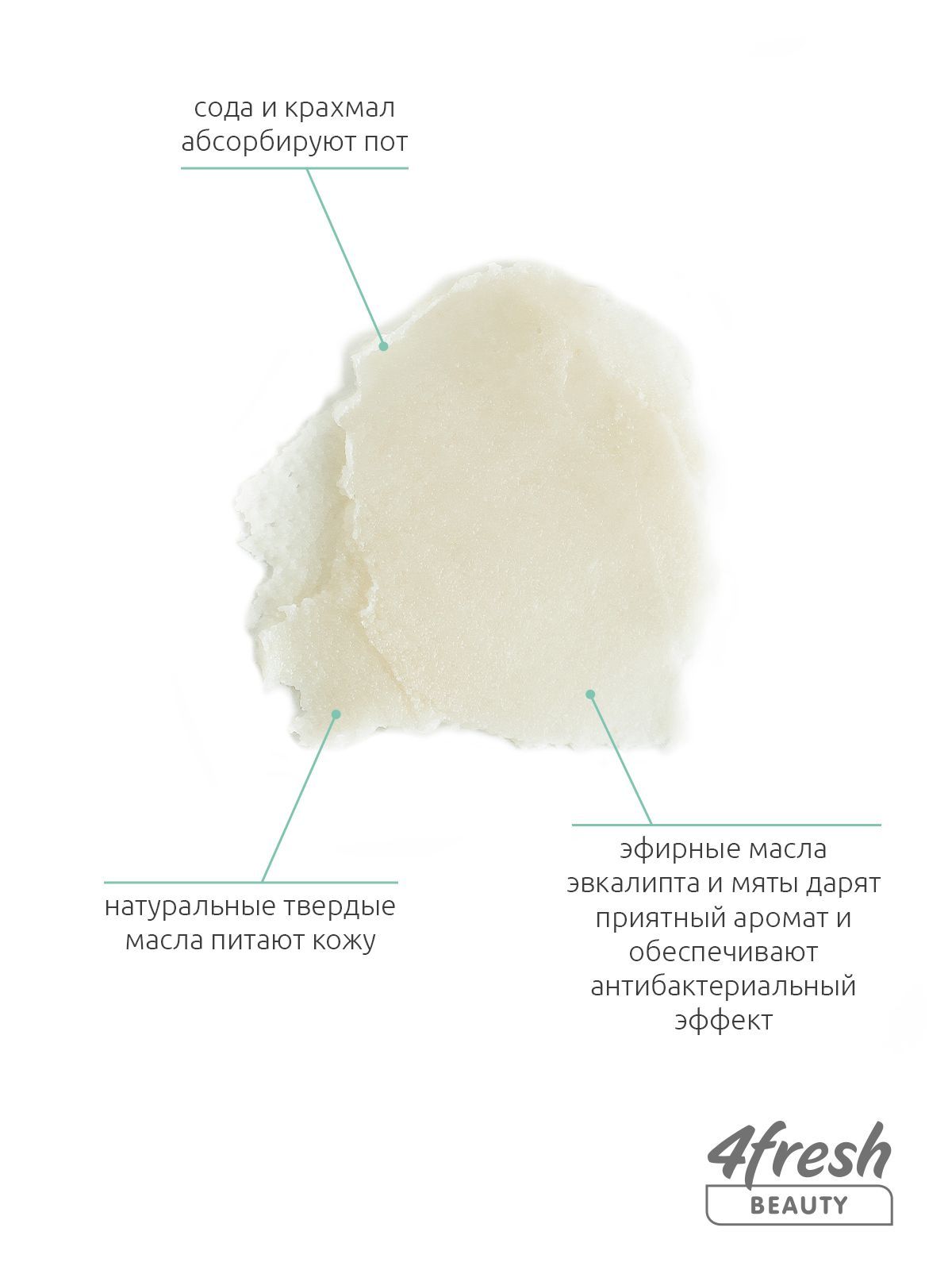 Сода и крахмалАбсорбируют влагу, оказывают дезодорирующее  и антибактериальное действиеМасла ши и кокосаУхаживают за кожей, отталкивают влагу, заживляют микротрещинки и повреждения.АллантоинУскоряет заживление повреждений кожи,  оказывает противовоспалительный эффект Пчелиный воскСнимает воспаление, дарит дезодоранту правильную тающую и пластичную консистенцию.100% натуральный составБез солей алюминия