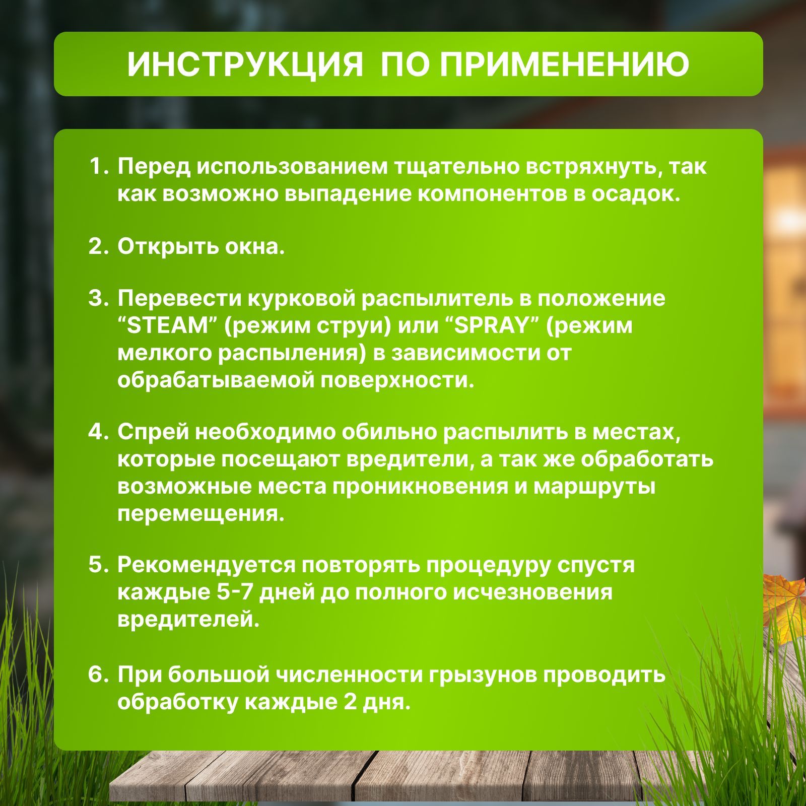 Перед применением тщательно встряхнуть, возможно выпадение компонентов в осадок. 2. Открыть окно. 3. Перевести курковой распылитель в положение «STEAM» (режим струи) или «SPRAY» (режим мелкого распыления) в зависимости от обрабатываемой поверхности. 4. Спрей необходимо обильно распылить в местах, которые посещают вредители, а также обработать возможные места проникновения и маршруты перемещения. 5. Рекомендуется повторять процедуру спустя каждые 5-7 дней до полного исчезновения вредителей. 6. При большой численности грызунов проводить обработку каждые 2 дня.