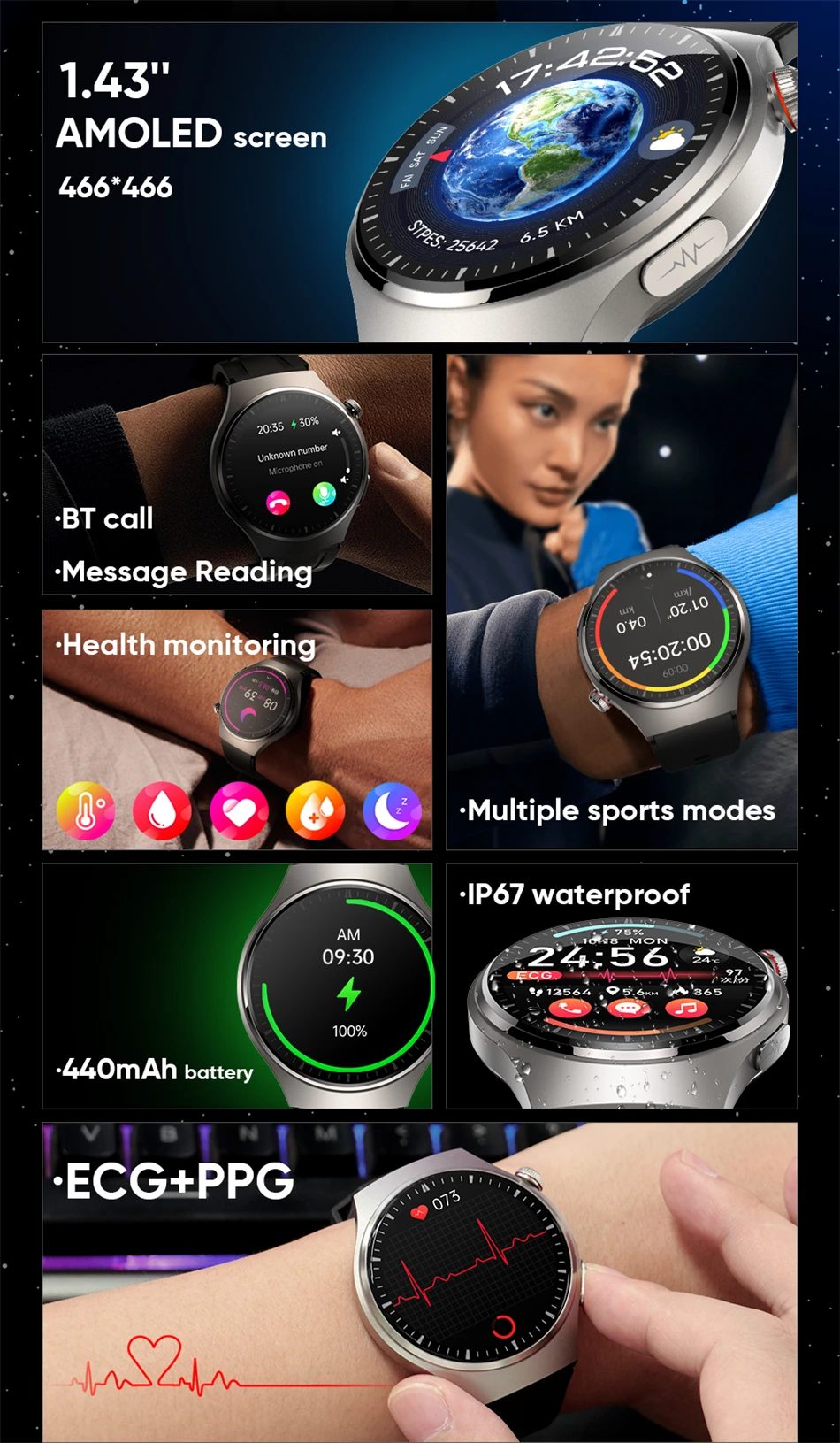 Неинвазивные мужские смарт-часы с функцией измерения сахара в крови, ЭКГ + ППГ, Bluetooth, звонки, 466*466 AMOLED, 1,43 дюйма, HD экран