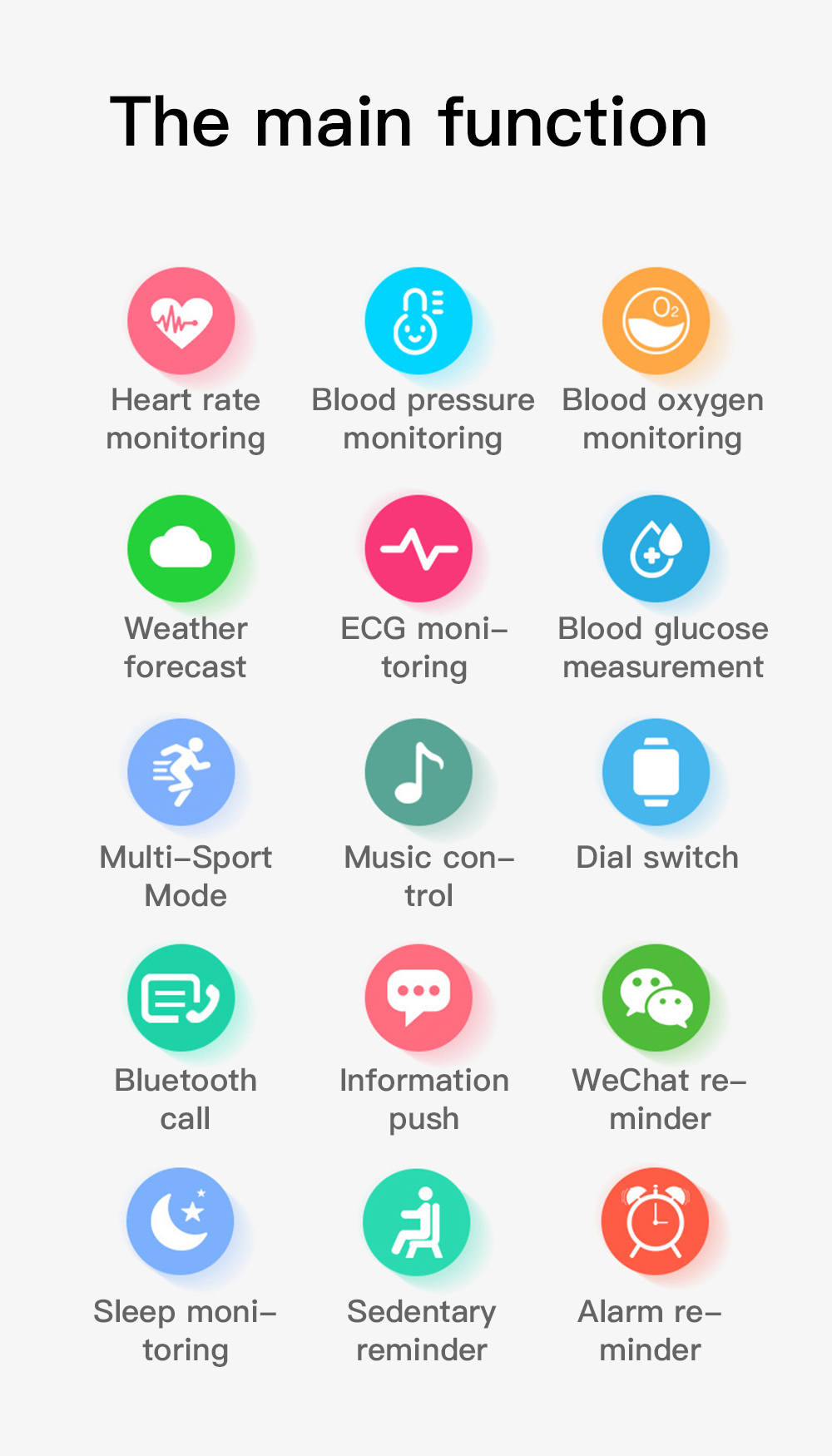 Регулярные функции: подсчет шагов, расстояние, калории, вызов, голосовой помощник, частота сердечных сокращений, артериальное давление, температурный тест, Metо, тренировка дыхания, секундомер, таймер, калькулятор, установка времени и даты, мини-игры, отслеживание женских периодов, воспроизведение музыки, управление музыкой, камера дистанционного управления, отображение погоды, Дисплей на запястье, поиск мобильного телефона (необходимо подключить приложение) и т. д.