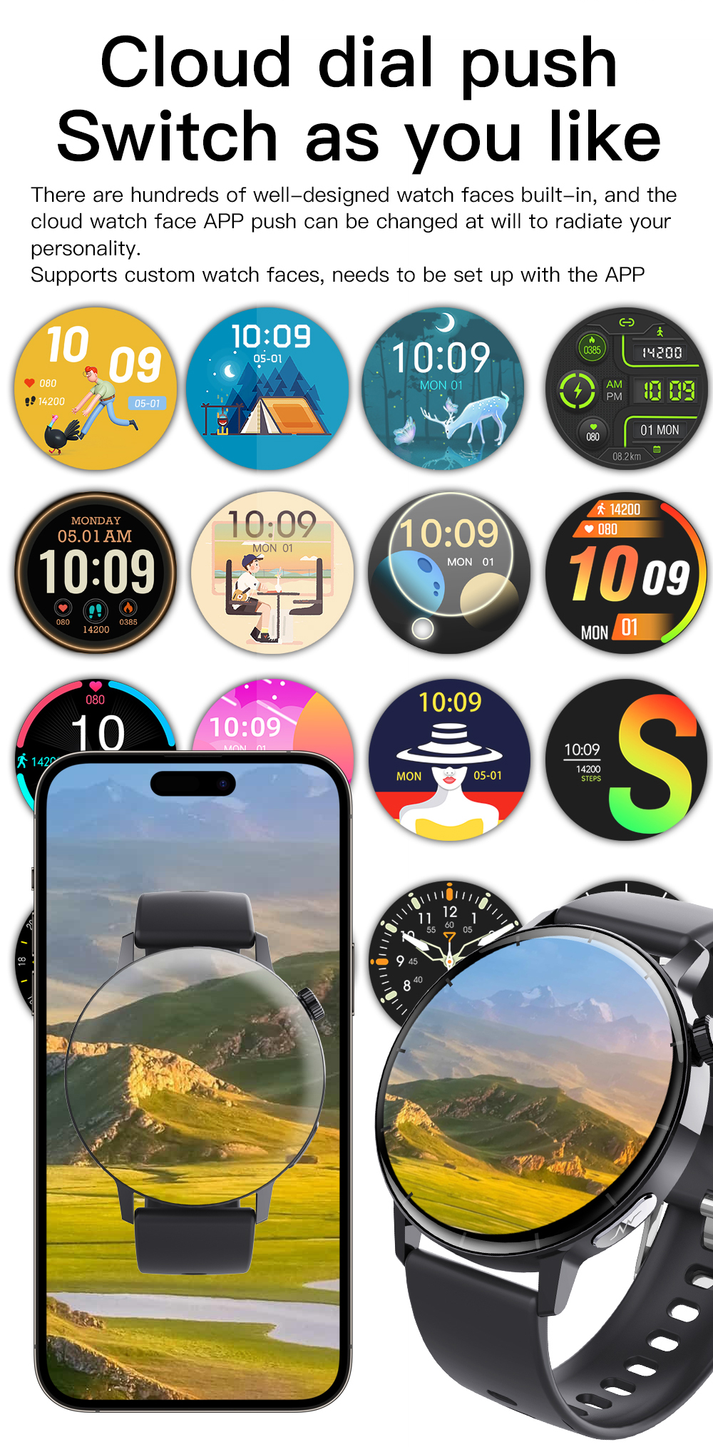 Множественный циферблат: 6 циферблат по умолчанию + 1 циферблат Market + 1 пользовательский циферблат"