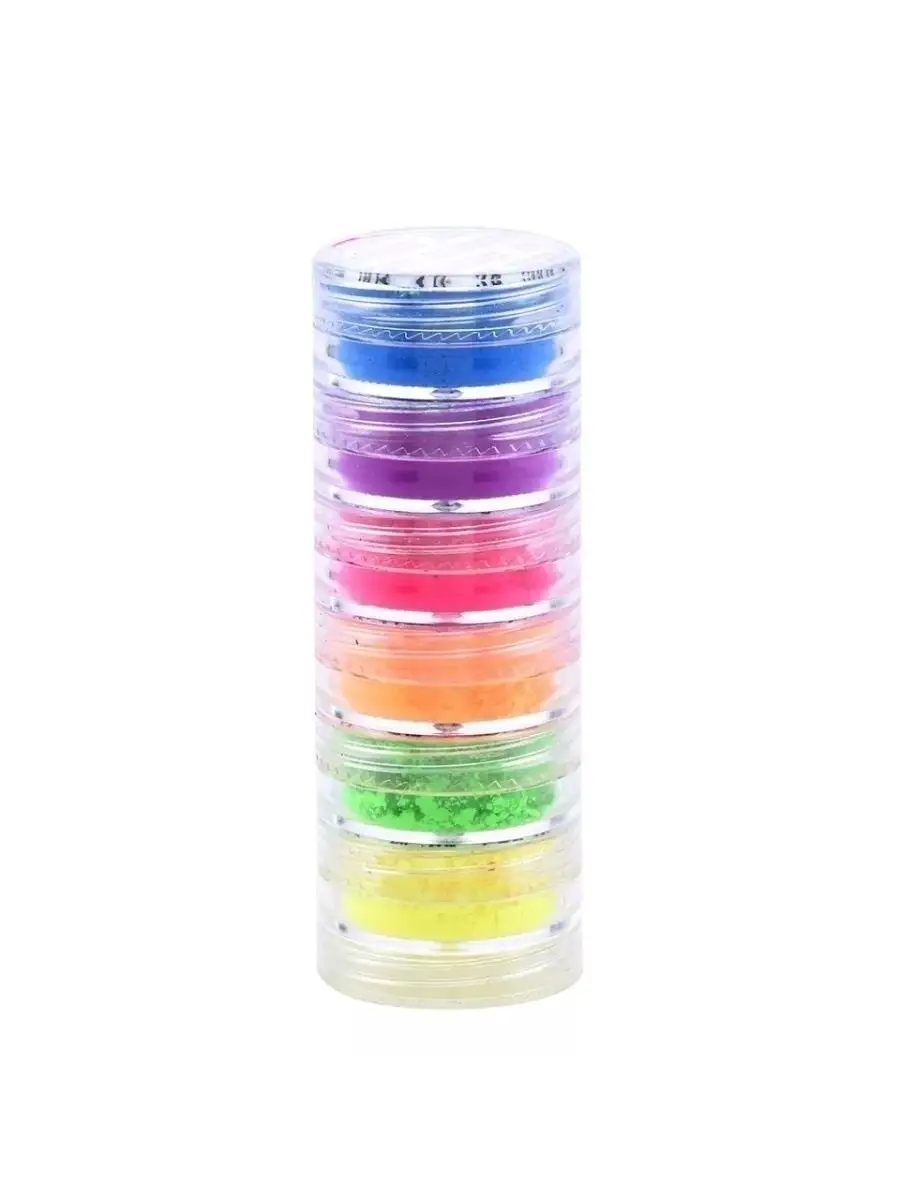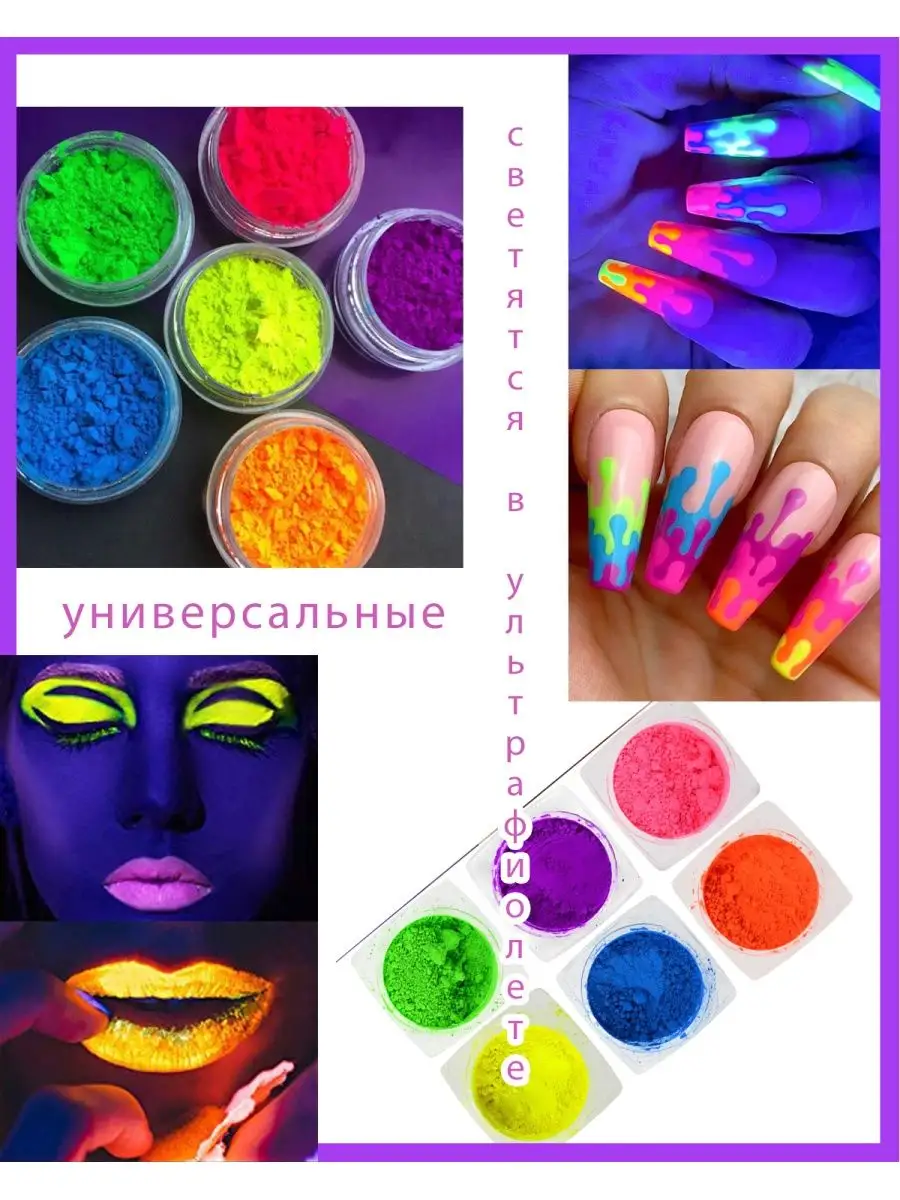 Комплектация Неоновые пигменты для ногтей дизайна маникюра творчества и подделок 6 цветов; Неоновые цветные тени для макияжа 6 цветов; Для цветного стемпинга ногтей и маникюра 6 цветов; набор блесток для дизайна декора ногтей маникюра; Блестки поталь сухоцветы втирка пигменты стразы украшения для ногтей маникюра набор