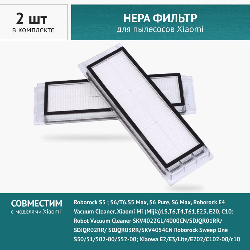 НЕРА Фильтр 2шт для робот пылесоса Xiaomi S5, S5 Max, S6 Pure, S6 Max, Roborock E4, Vacuum Cleaner, 1S, T6, T4, T61, E25, S50, s502-02, S51, E25, E20, C10; Xiaowa E2, E3, E4, E5, E202-00, Vacuum 2