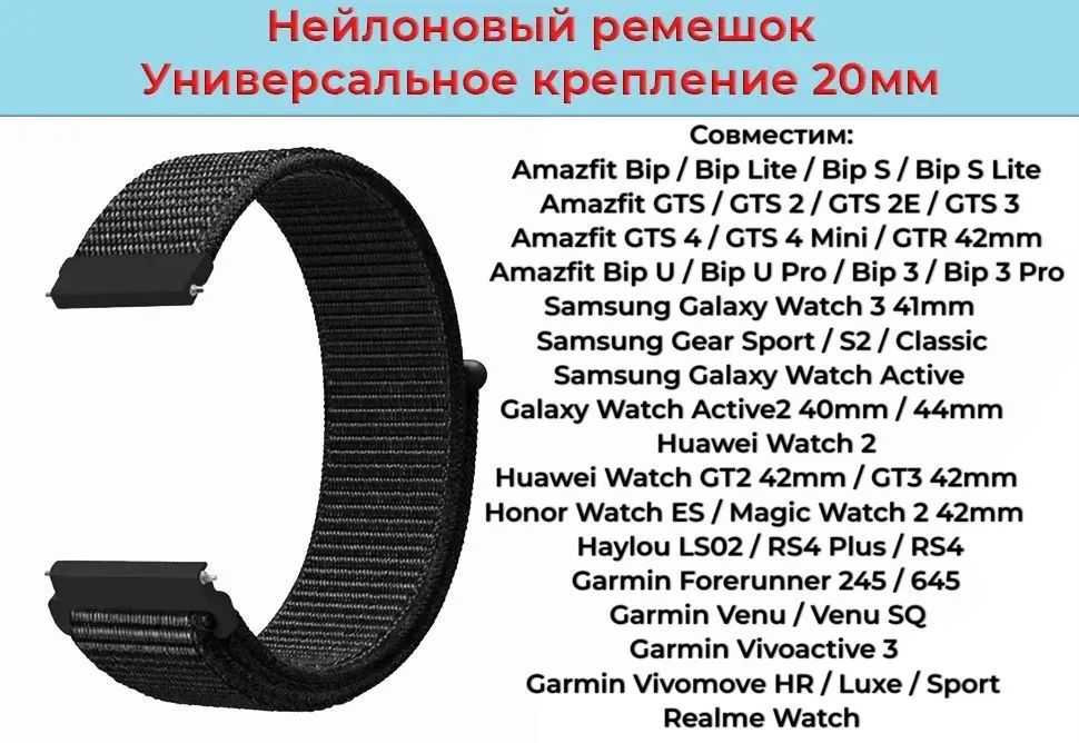 Нейлоновый ремешок для часов 20мм Тканевый браслет 20 мм для смарт-часов Samsung Galaxy Watch , Amazfit Bip / GTS , Huawei Honor Watch , Garmin , Xiaomi Haylou Mibro , Realme / Плетеный Ремень 20mm