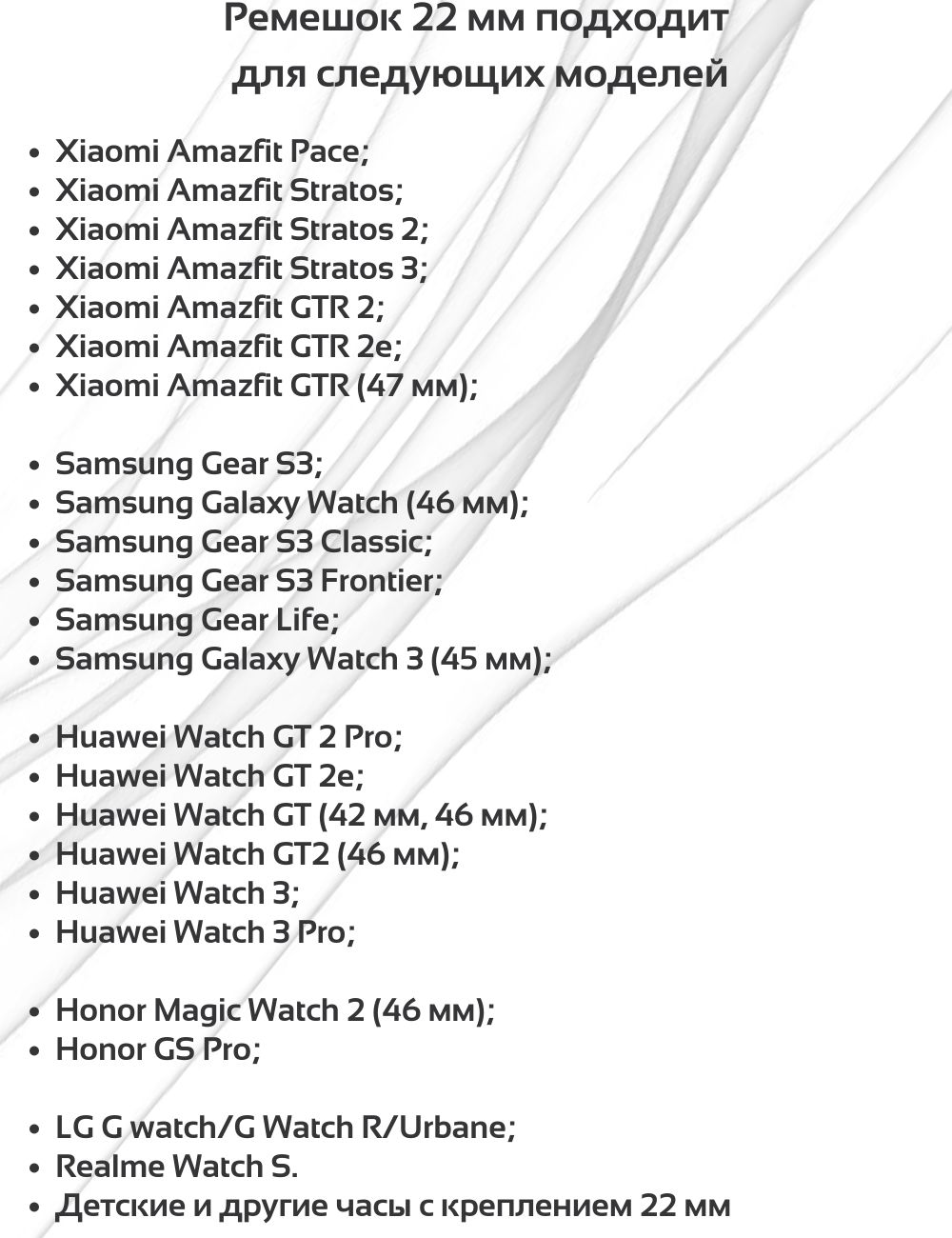Данный ремешок совместим с любыми моделями часов с шириной крепления 22 мм