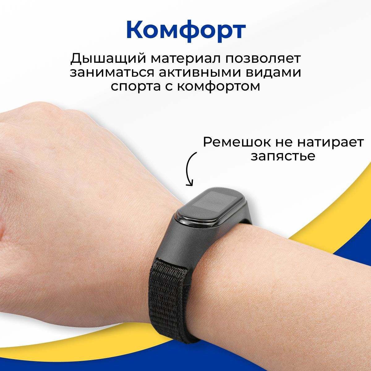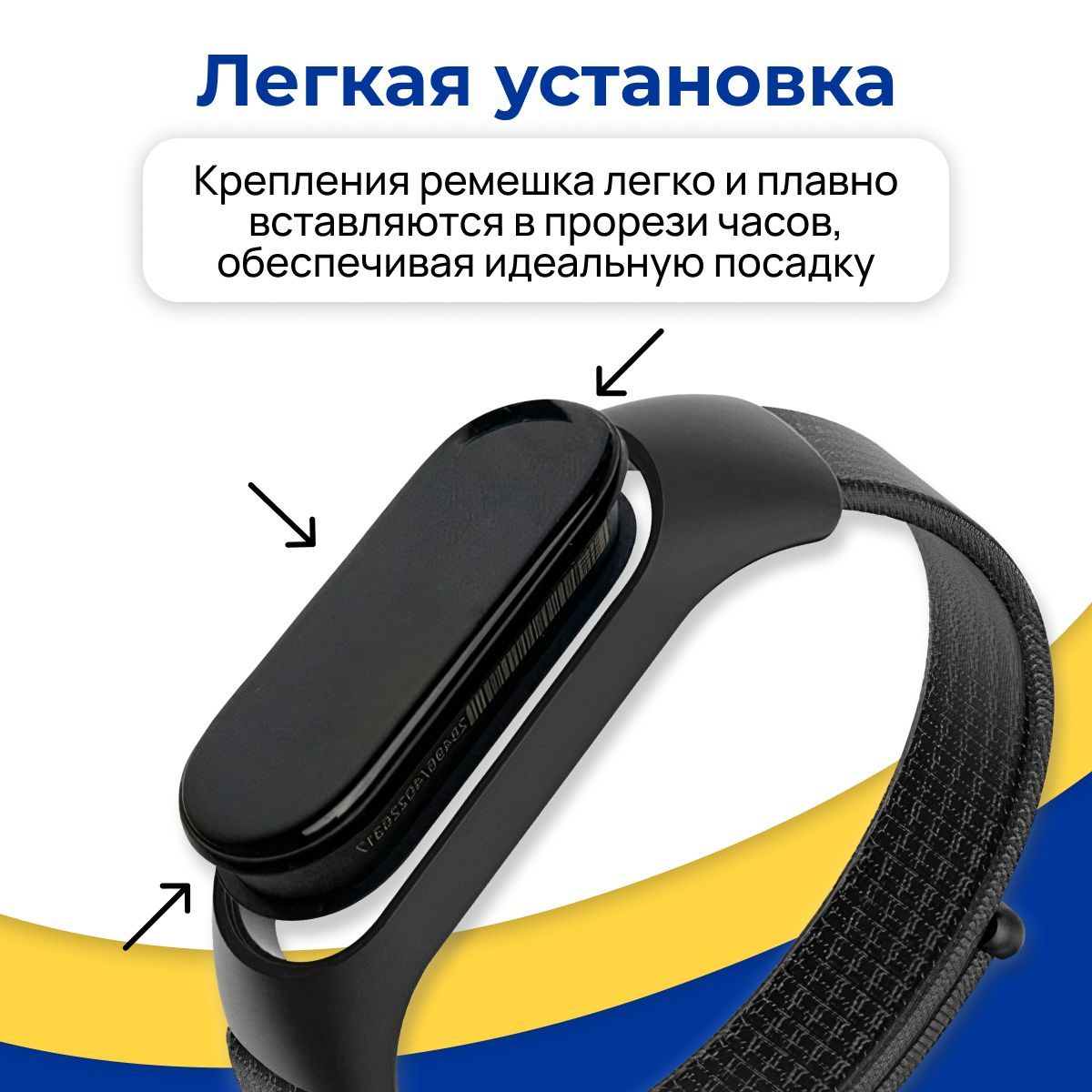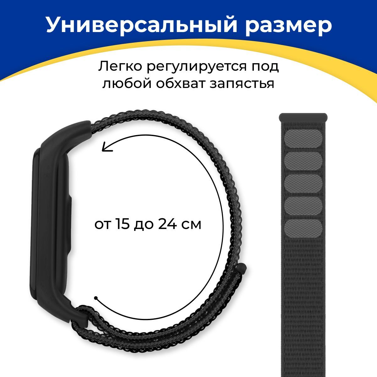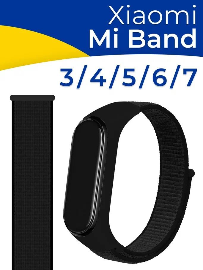 Нейлоновый ремешок для фитнес браслета Xiaomi Mi Band 3-4-5-6 и 7 / Тканевый ремень на липучке для умных смарт часов Сяоми Ми Бэнд 3-4-5-6 и 7, Черный