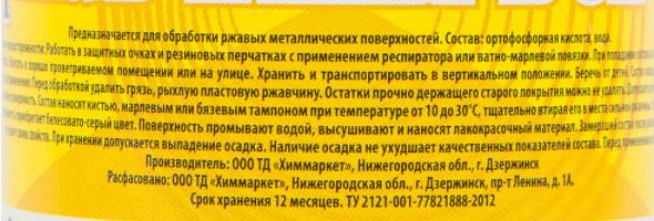 Описание: Нейтрализатор ржавчины ВСН-1 отечественного производства предназначен для антикоррозийной обработки металлических поверхностей перед покраской. Содержит в составе водную композицию кислот, имеет гелеобразную консистенцию, полностью удаляет ржавчину и окислы с поверхности меди, железа и их сплавов.
