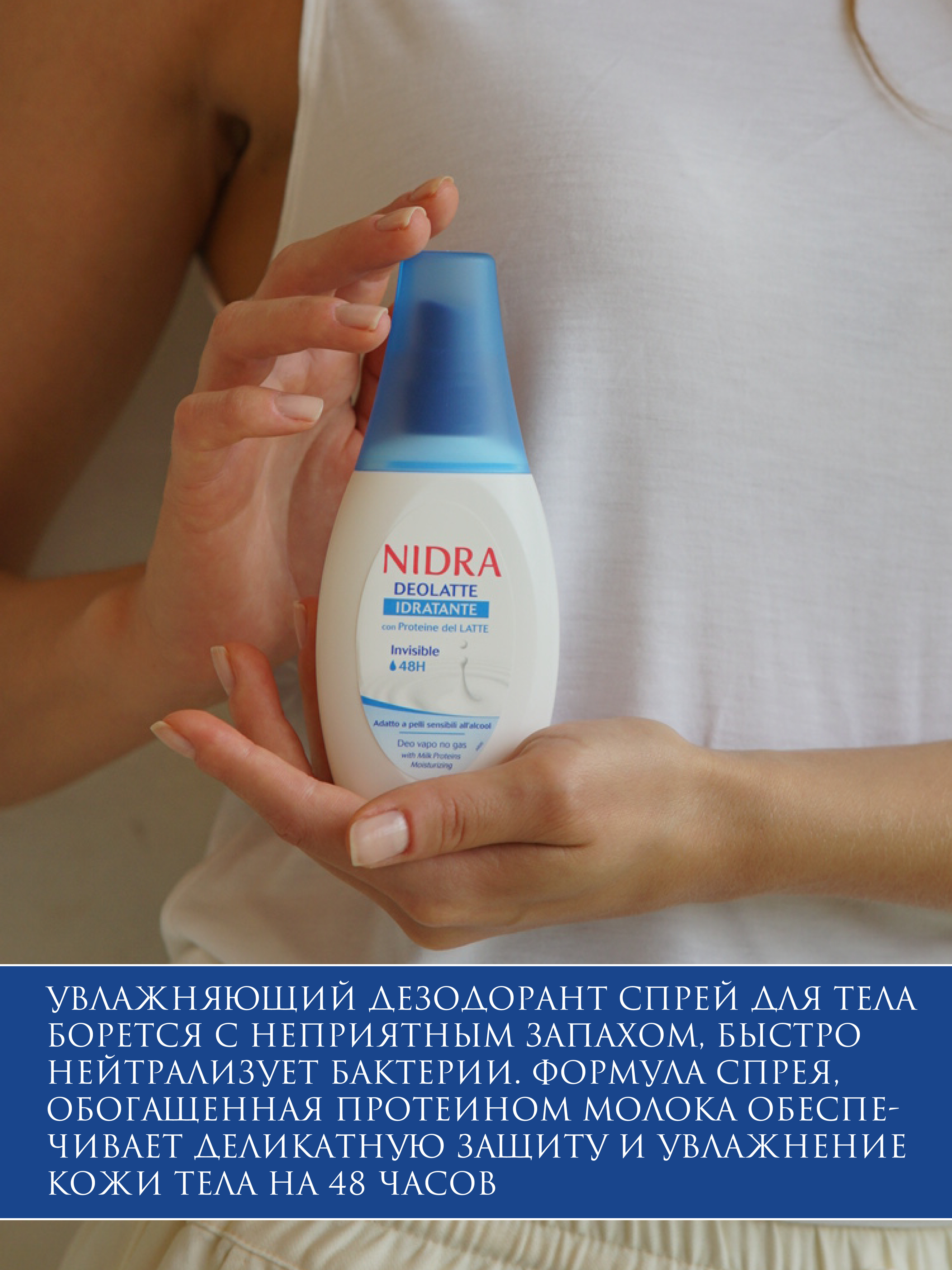 Nidra Дезодорант-антиперспирант спрей для тела увлажняющий с молочными протеинами, защита 48 часов 75 мл