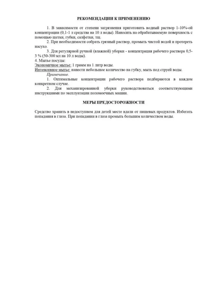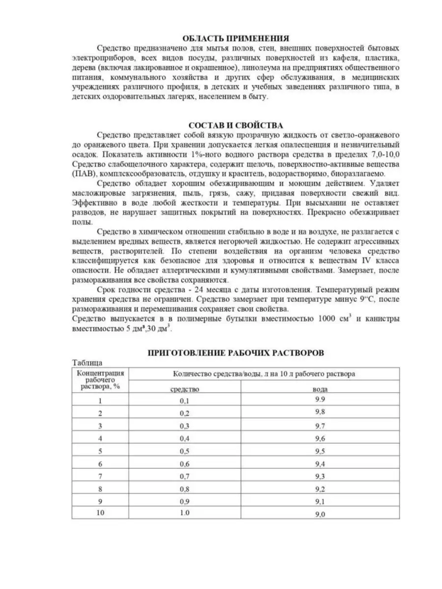 Описание: Ника-Универсал жидкое средство для мытья поверхности качественно решит задачу чистки напольных поверхностей. Универсальное средство для уборки подходит для любых напольных покрытий, включая лакированный паркет и ламинат, а также для мытья стен. Удаляет масложировые загрязнения, пыль, грязь, сажу. Не требует смывания и не оставляет разводов. Пользоваться им просто: достаточно развести небольшое количество концентрата водой и промыть пол получившимся раствором. Для работы со сложными загрязнениями можно применять вещество локально. Эффективное средство для чистки пола. Качество проведенной с помощью данного продукта уборки впечатляет: поверхность сияет чистотой, на полу не остается разводов. Средству под силу устранить практически любые загрязнения, не нарушая при этом защитного покрытия на поверхности. Ника-Универсал обладает прекрасными обезжиривающими и моющими свойствами, которые сохраняются в воде любой температуры и жесткости. Продукту не требует последующего смывания водой, за счет чего процесс уборки значительно облегчается и становится быстрее. Товар универсален и подходит для чистки различных типов поверхности: плитки, линолеума, деревянного пола, для кафеля. Его можно успешно применять и в качестве чистящего средства для стен. Вещество без труда справится с застарелой грязью, жиром и въевшимися пятнами. Товар сертифицирован и прошел все необходимые испытания. Его применение полностью безопасно для здоровья и окружающей среды, жидкость не вызывает аллергических реакций и не подвержена процессу разложения с выделением токсичных веществ. ПРИМЕНЕНИЕ Область использования охватывает: медицинские учреждения; предприятия общепита; пищевую индустрию; учреждения санаторного и гостиничного типа; торговлю и сферу услуг; бытовое применение. Процедура уборки с помощью профессиональной бытовой химии становится значительно проще. Средство для мытья полов Ника-Универсал экономично расходуется позволяющий надолго забыть о покупке бытовой химии по уходу за напольной поверхностью. ХАРАКТЕРИСТИКИ: обладает хорошим обезжиривающим и моющим действием; удаляет масло-жировые загрязнения, пыль, грязь, сажу, придавая поверхности свежий вид; эффективно в воде любой жесткости и температуры; не оставляет разводов при высыхании; не нарушает защитных покрытий на поверхностях; не разлагается с выделением вредных веществ; не содержит агрессивных веществ, растворителей; классифицируется как безопасное для здоровья и относится к веществам IV класса опасности; не обладает аллергическими и кумулятивными свойствами; замерзает и после размораживания все свойства сохраняются.