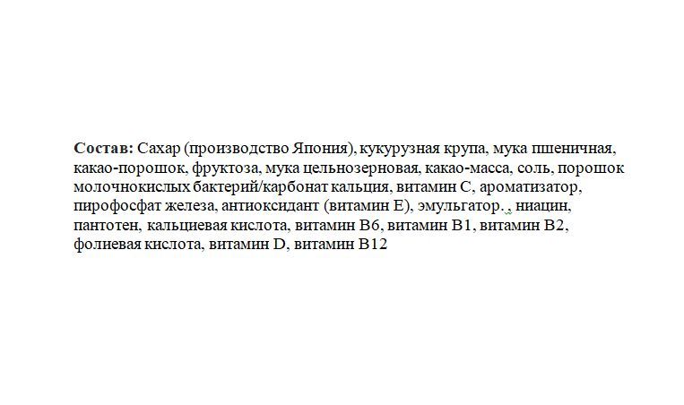 Сахар (производство Япония), кукурузная крупа, мука пшеничная, какао-порошок, фруктоза, мука цельнозерновая, какао-масса, соль, порошок молочнокислых бактерий/карбонат кальция, витамин С, ароматизатор, пирофосфат железа, антиоксидант (витамин Е), эмульгатор. , ниацин, пантотен, кальциевая кислота, витамин B6, витамин B1, витамин B2, фолиевая кислота, витамин D, витамин B12