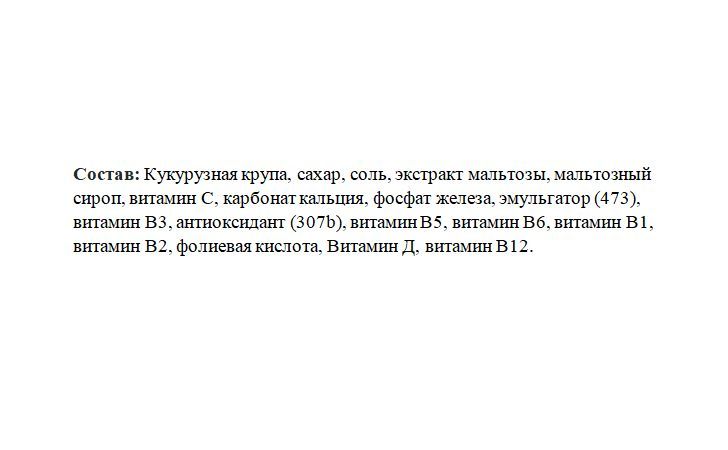 Кукурузная крупа, сахар, соль, экстракт мальтозы, мальтозный сироп, витамин С, карбонат кальция, фосфат железа, эмульгатор (473), витамин В3, антиоксидант (307b), витамин В5, витамин В6, витамин В1, витамин В2, фолиевая кислота, Витамин Д, витамин В12.