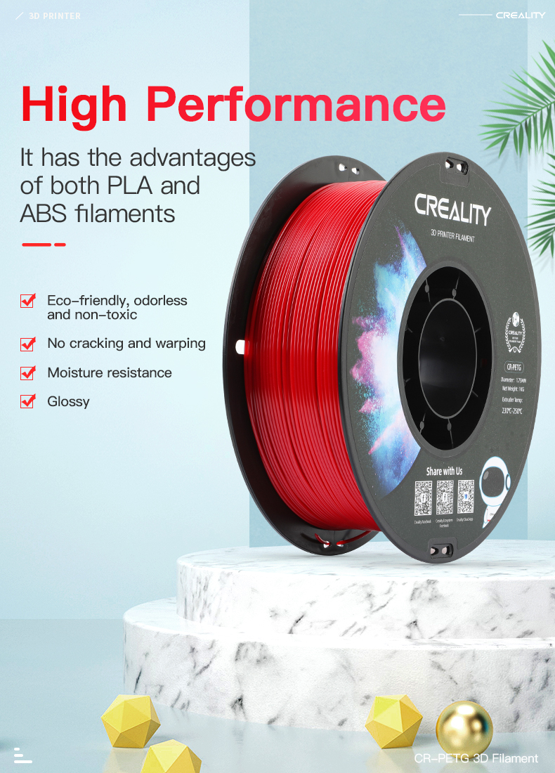 PETG has excellent weather resistance and chemical resistance, no odor and non-toxic, which are friendly to the environment. It can print with fine results.