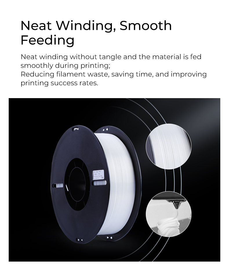 Neat winding without tangle and the material is fed smoothly during printing; Reducing filament waste, saving time, and improving printing success rates.