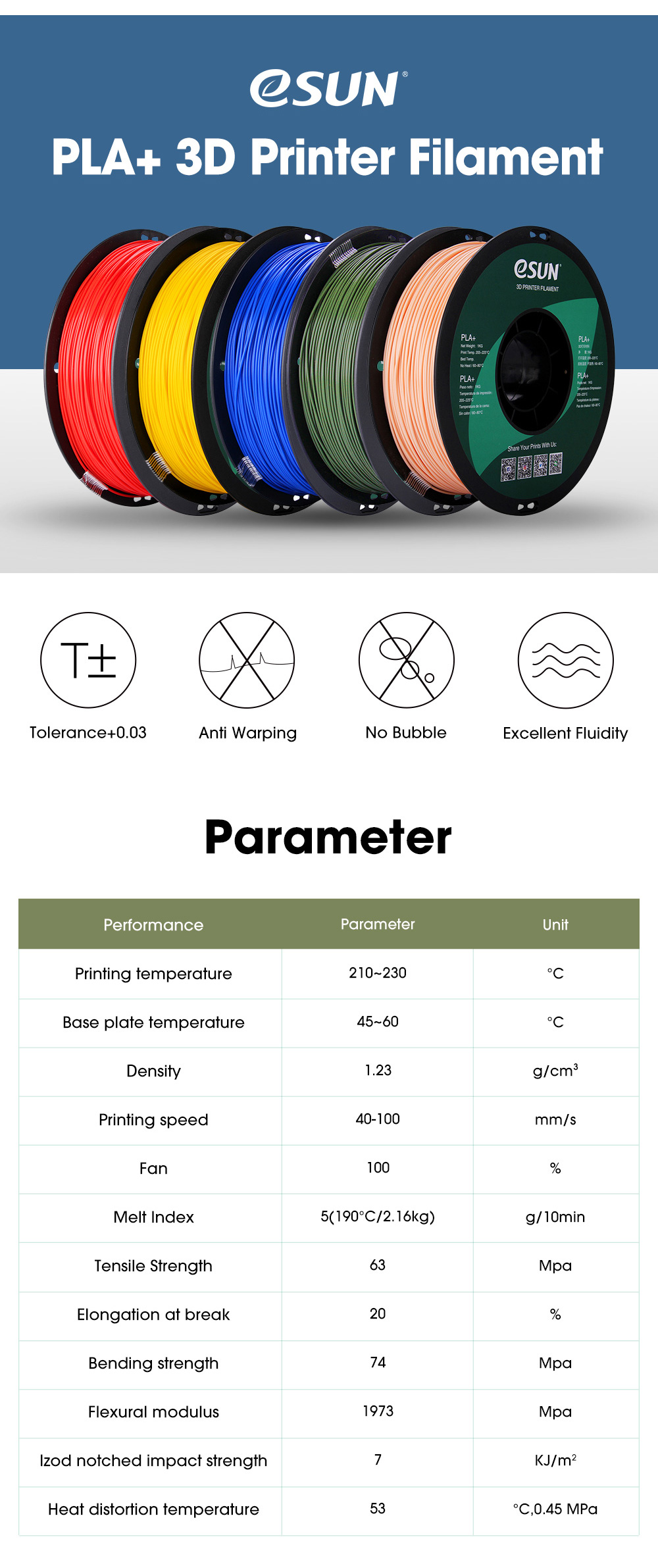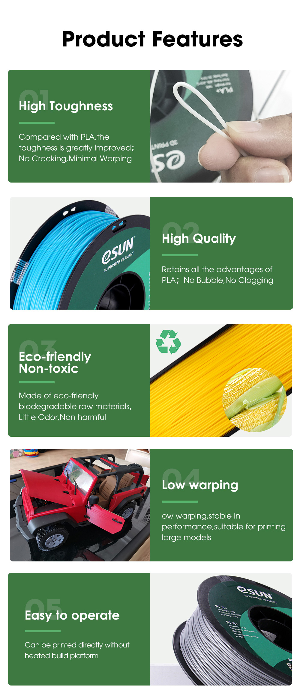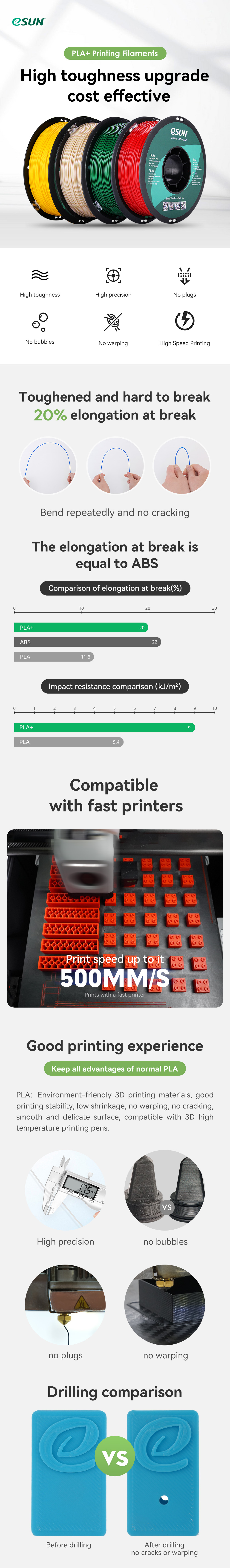 【Простота печати】 PLA +-это улучшенная версия обычного PLA. Он имеет более высокую прочность и лучшую прочность, его нелегко сломать. Изготовлен из крахмального сырья, полученного из растительных ресурсов, идеально подходит для внутренней печати.