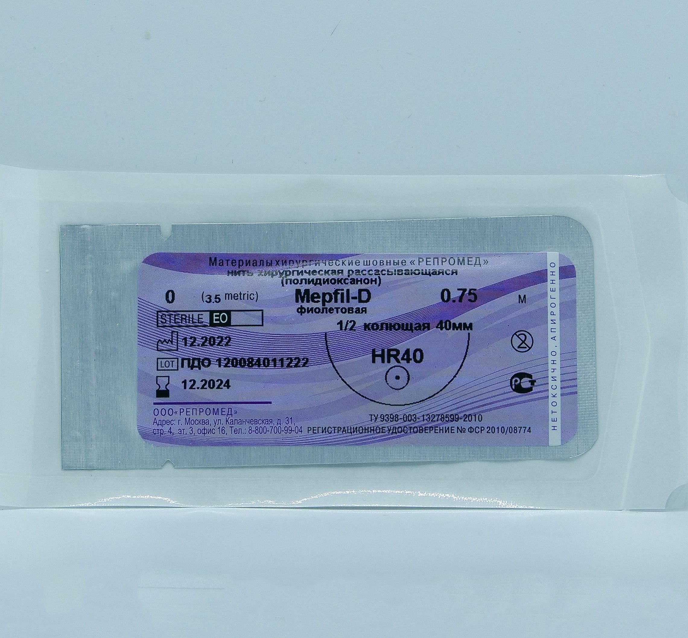 Нить хирургическая рассасывающаяся Mepfi-D (фиолетовая из полидиоксанона PDO), 0,75м с иглой HR40мм.