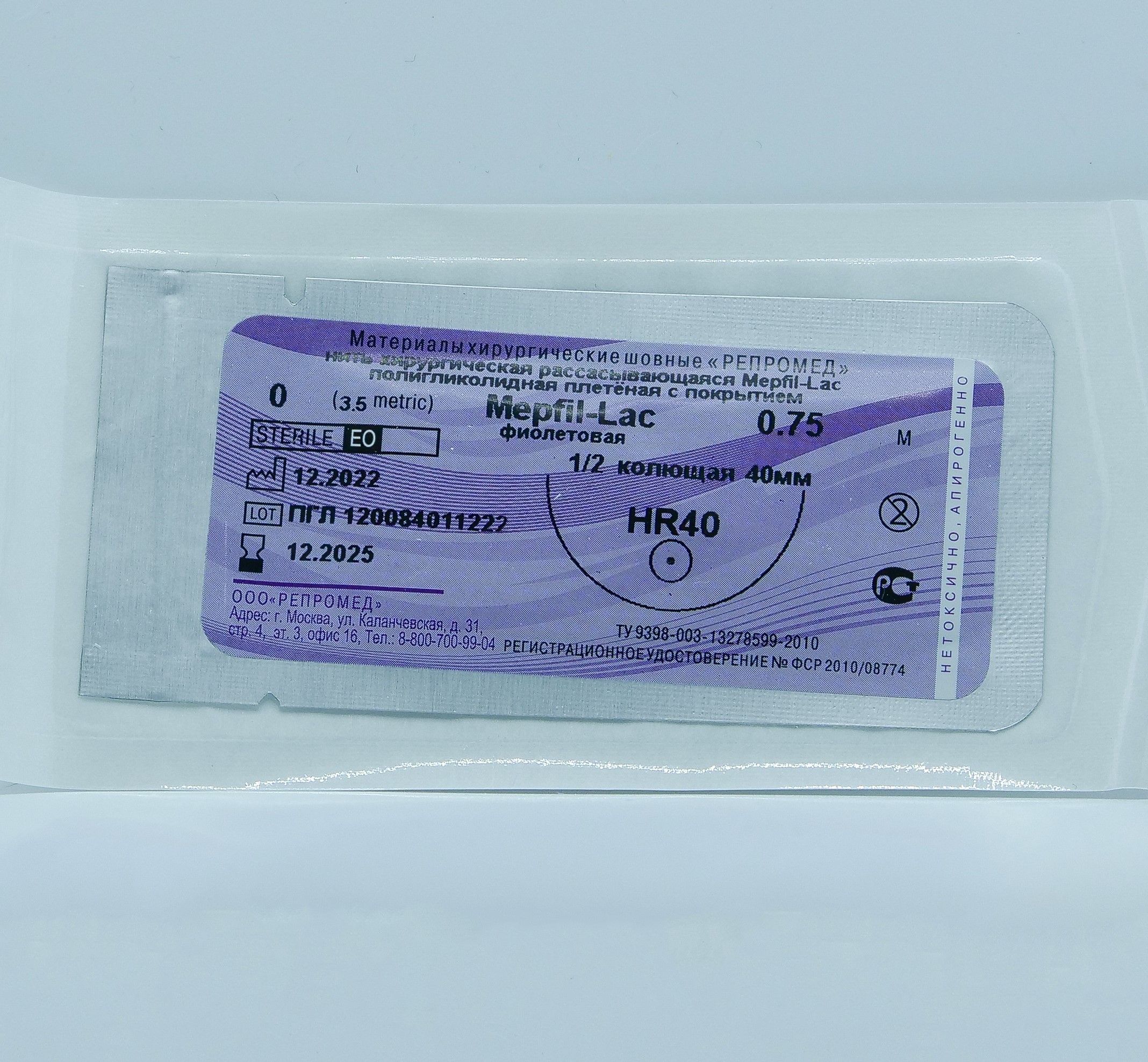 Нить хирургическая рассасывающаяся Mepfi-Lac(полигликолид-лактид плетёный с покрытием фиолетовый), 0,75м с иглой HR40 мм.