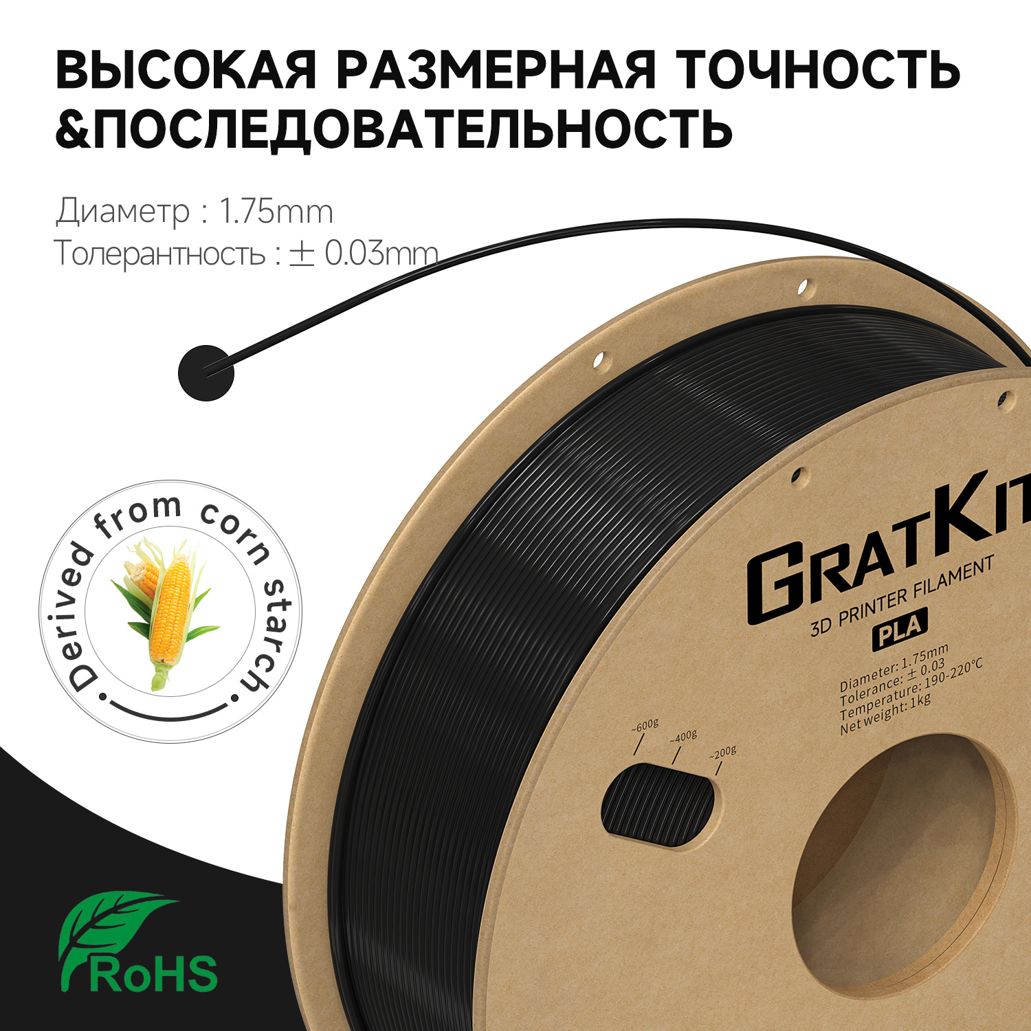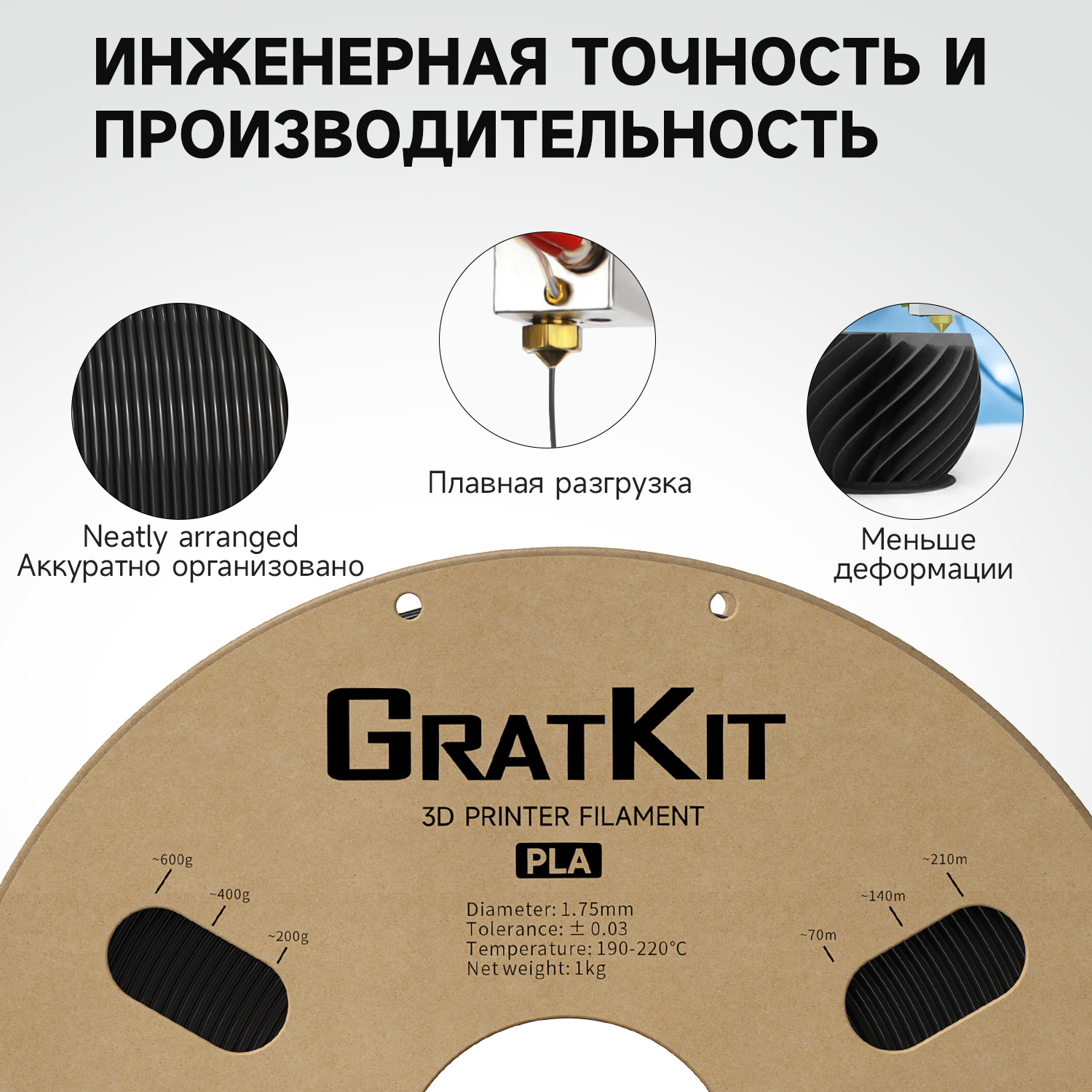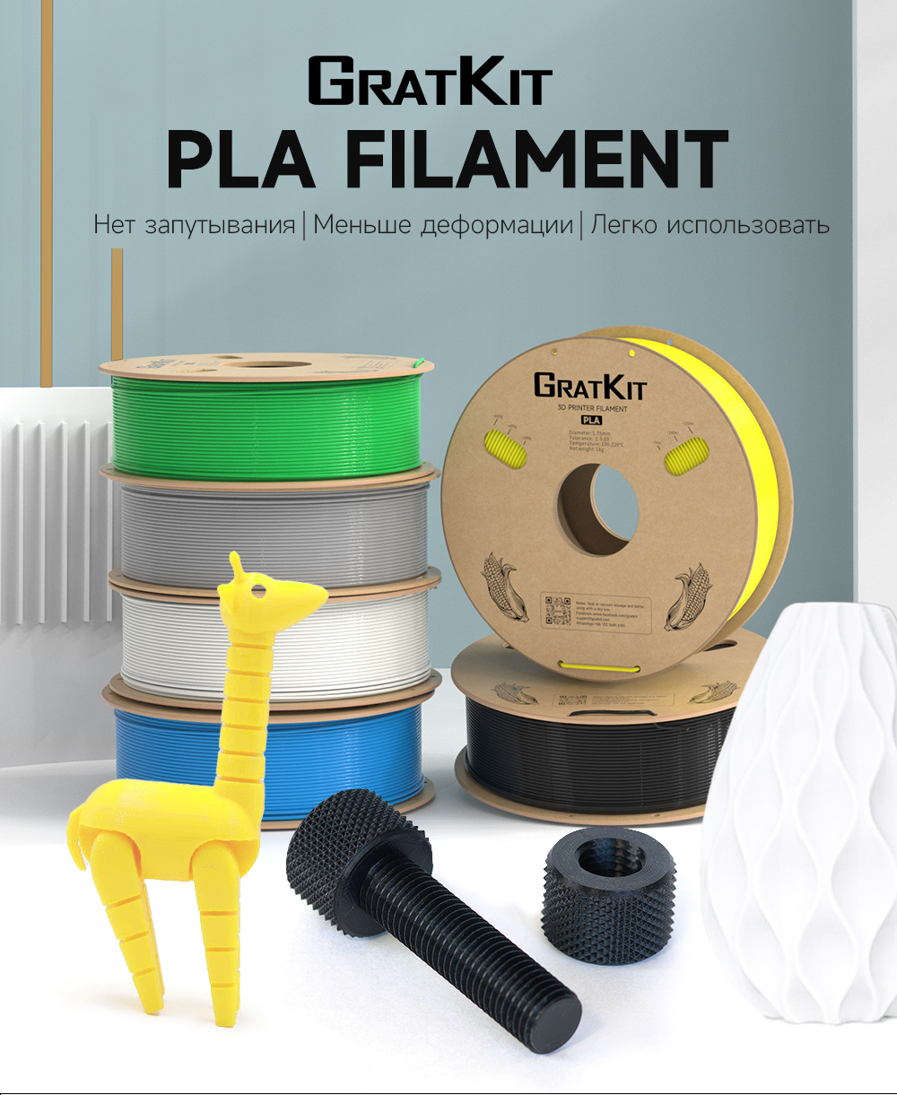 Gratkit Стандартная PLA-нить 1 кг 1,75 мм Высококачественная точность размеров +/-0,03 мм для 3D-принтера Быстрая доставка