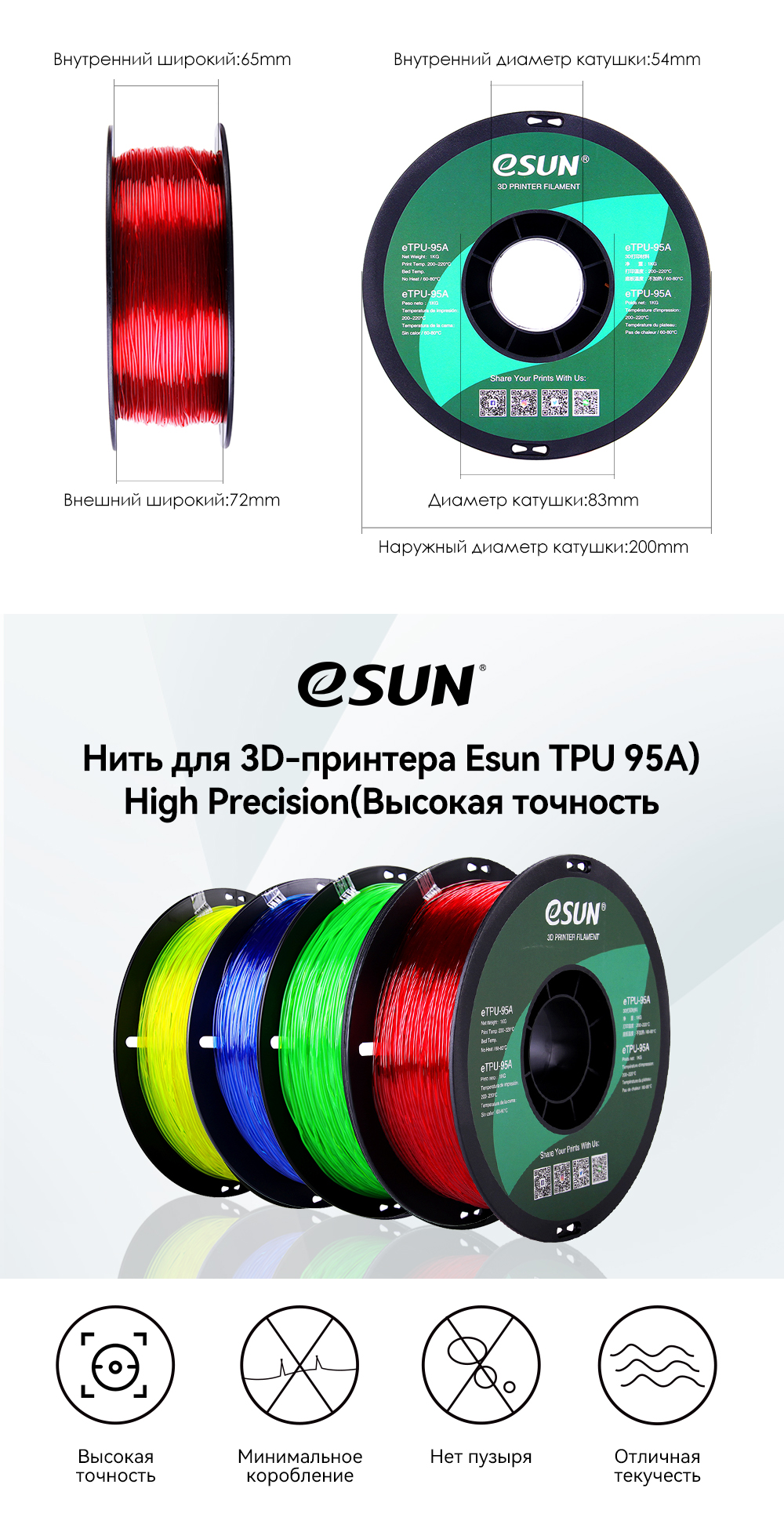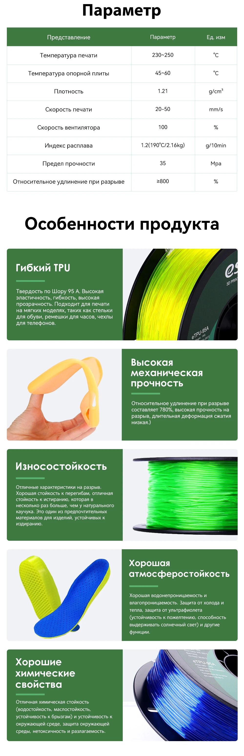 【Гибкий ТПУ】 ВЕРДОСТЬ по Шору 95А. Сильная гитара. Высокая устойчивость. Высокая прозрачность. Износостойкая. Высококая механическая прочность. Химическая устойчивость. Устойчив к Маслам, растворителям и царапинам. Совместимость с БОЛЬШИНСТВОМ 3D-принтеров FDM.