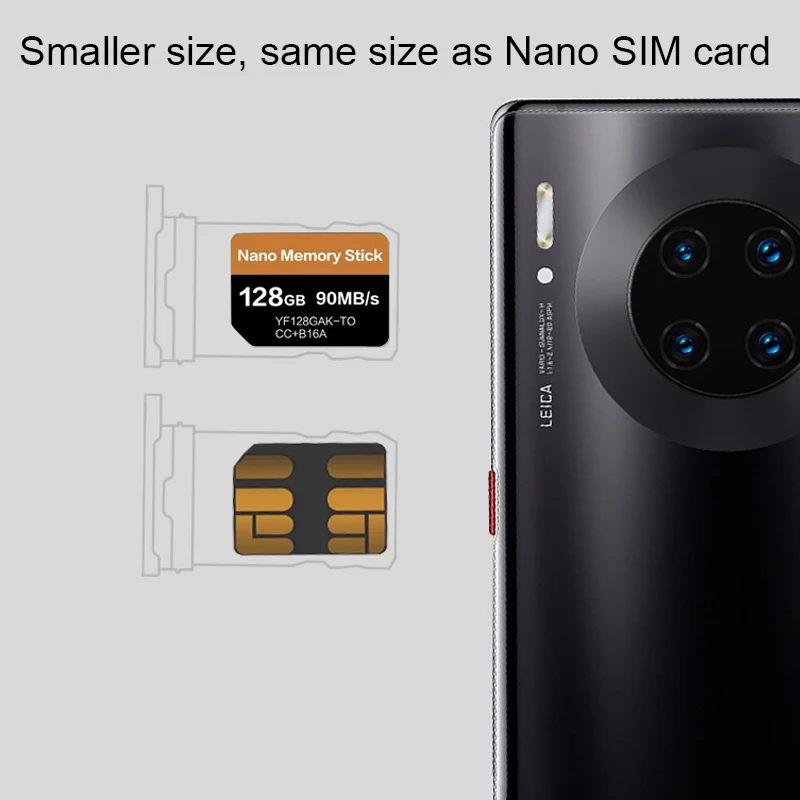 NM Card Suitable for mobile phone models: For Huawei P30 For Huawei P30 Pro For Huawei Mate 20 For Huawei Mate 20X For Huawei Mate 20XS For Huawei Mate 20 Pro For Huawei Mate 20 RS Porsche Design NM card information: Name: Nano Memory Card Read speed: 90MB/S Write speed: 70MB/S Size: about 12.3*8.8*0.7mm Capacity: 128GB Type: External expansion Product gross weight: about 80g