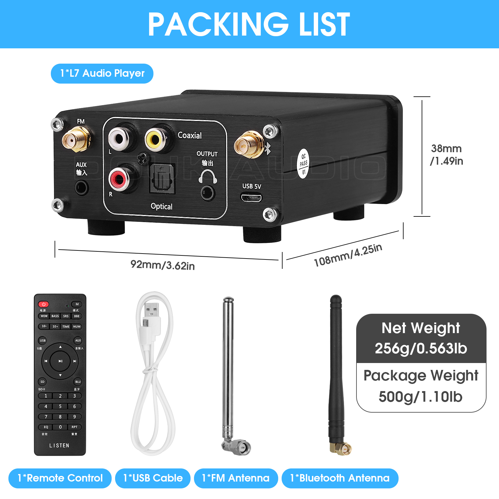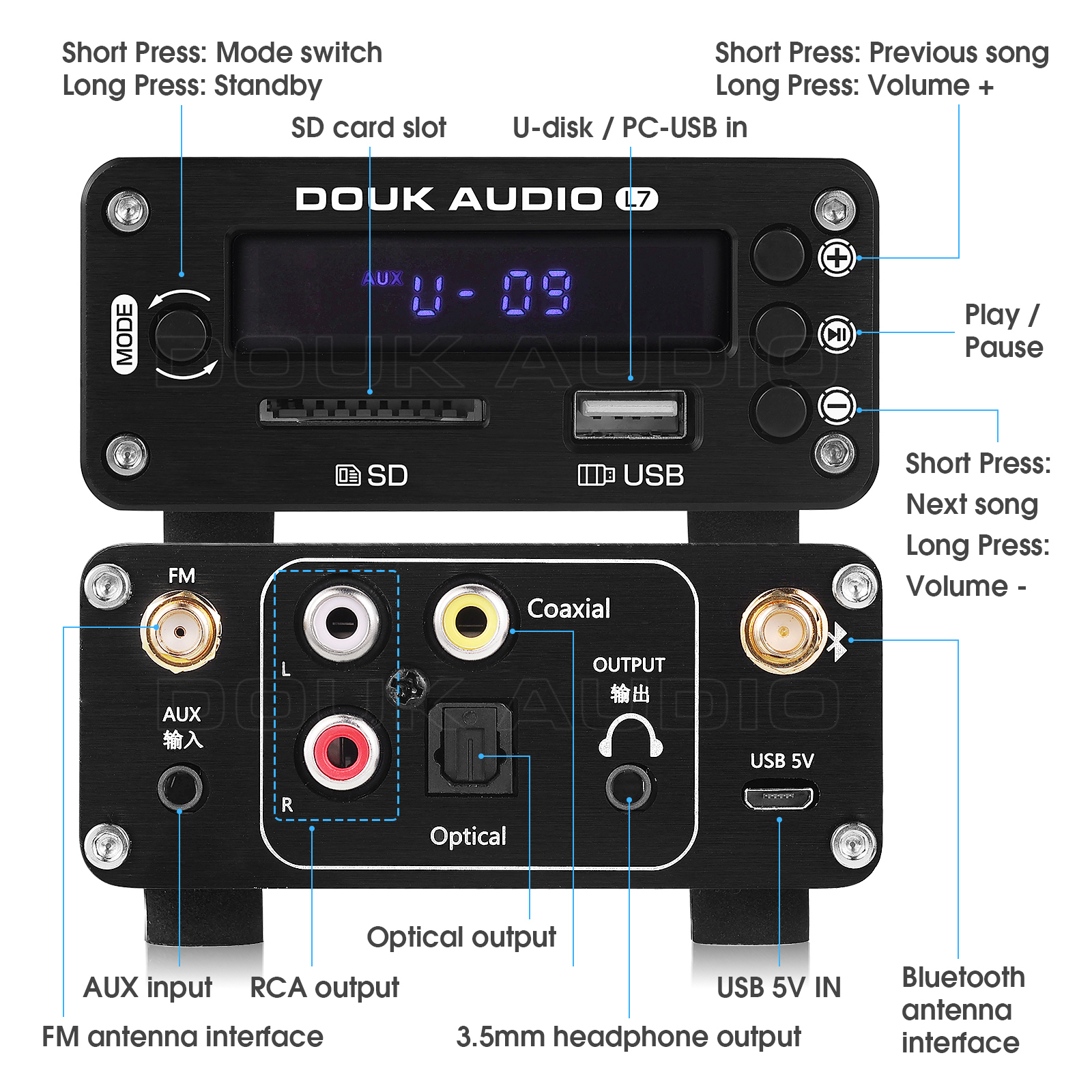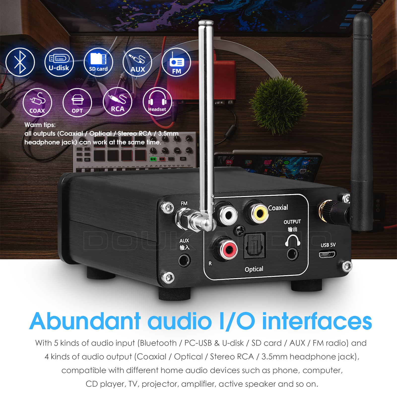 • Обильные аудио интерфейсы ввода/вывода: с 5 видами аудиовхода (Bluetooth / PC-USB и U-диск/SD-карта/AUX / FM-радио) и 4 вида аудиовыхода (коаксиальный/оптический/стерео разъем для наушников RCA/3,5 мм), совместимые с различными домашними аудиоустройствами, такими как телефон, компьютер, проигрыватель компакт-дисков, Телевизор, проектор, усилитель, активный динамик и так далее.