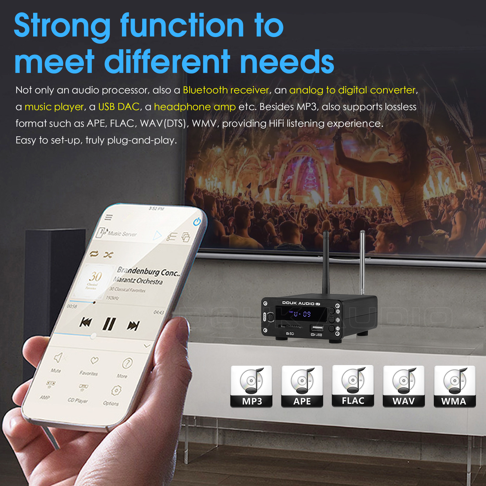 • Сильная функция для удовлетворения различных потребностей: не только Аудиопроцессор, но и приемник Bluetooth, аналого-цифровой преобразователь, музыкальный проигрыватель, USB-ЦАП, усилитель для наушников и т. Д. Помимо MP3, также поддерживает форматы без потерь, такие как APE, FLAC, WAV(DTS), WMV, обеспечивая качество прослушивания HiFi. Легко настроить, по-настоящему подключи и работай.