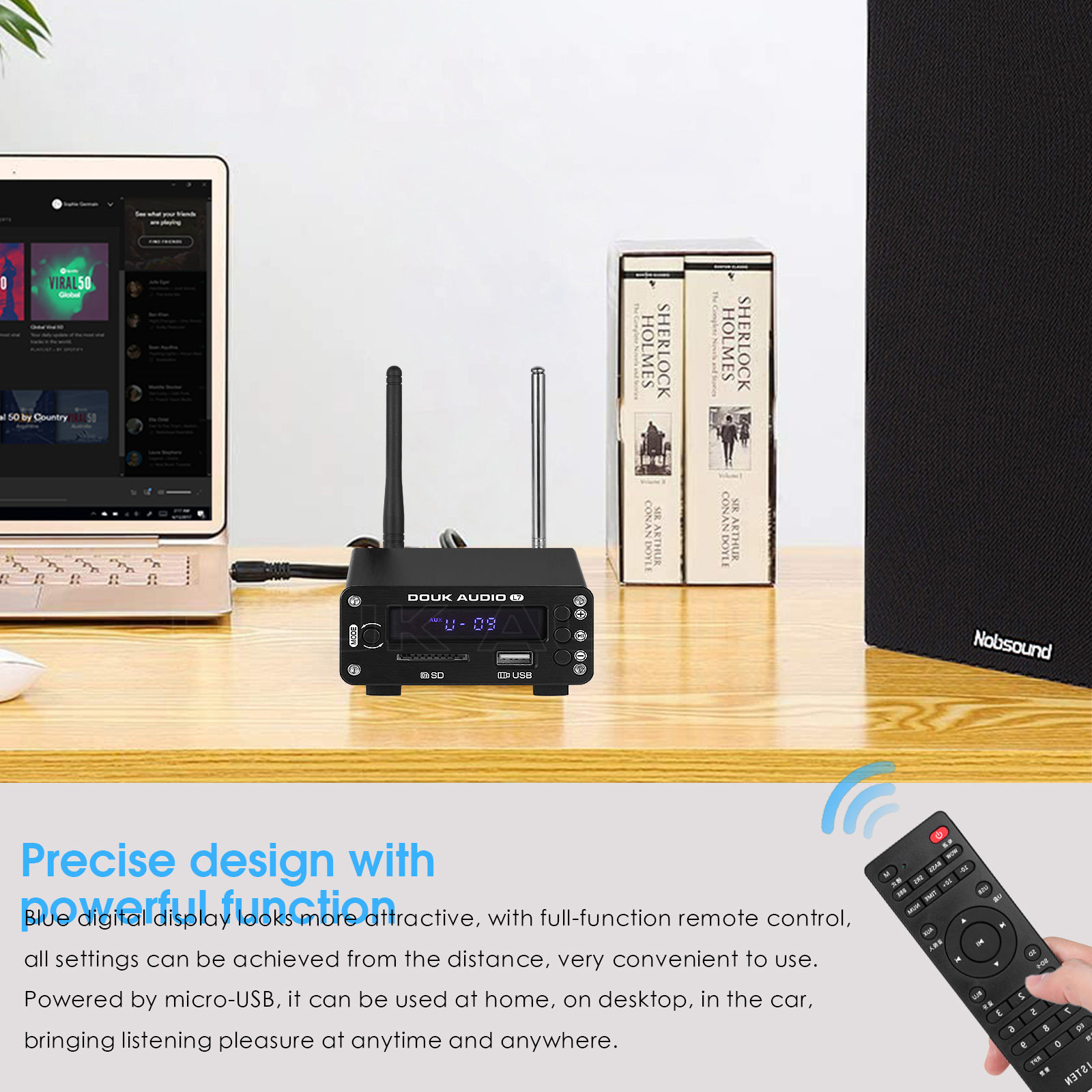 • Точный дизайн с мощной функцией, Синий цифровой дисплей выглядит более привлекательно, с полнофункциональным пультом дистанционного управления, все настройки могут быть достигнуты на расстоянии, очень удобны в использовании. Работающий от Micro-USB, его можно использовать дома, на рабочем столе, в машине, принося удовольствие от прослушивания в любое время и в любом месте.