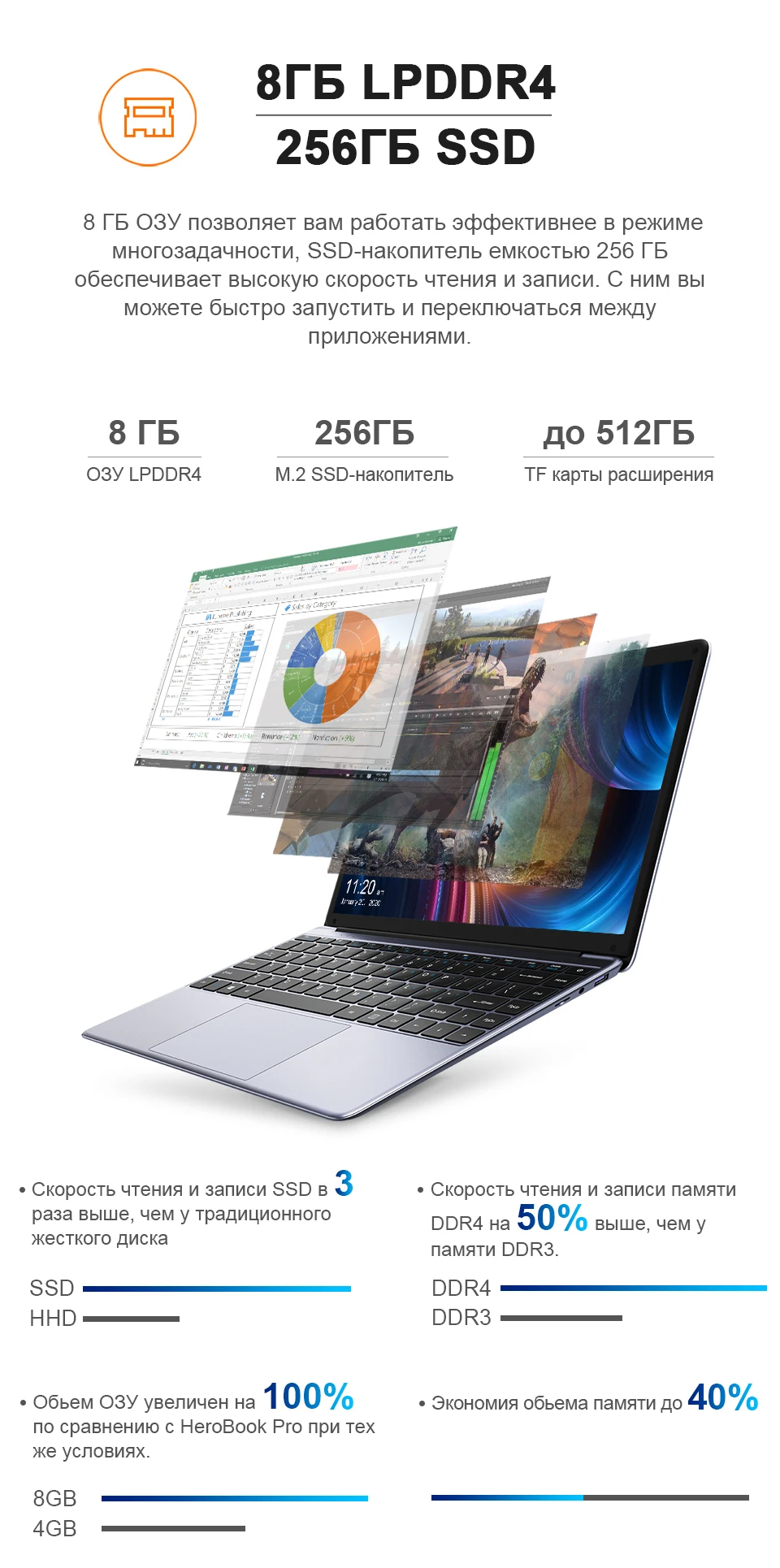 -CHUWI ноутбук с оперативной памятью 8 Гб Оперативная память + 256 Гб SSD, максимальная поддержка SSD Расширение памяти до 1 ТБ и флеш-карта памяти TF до 128 ГБ.