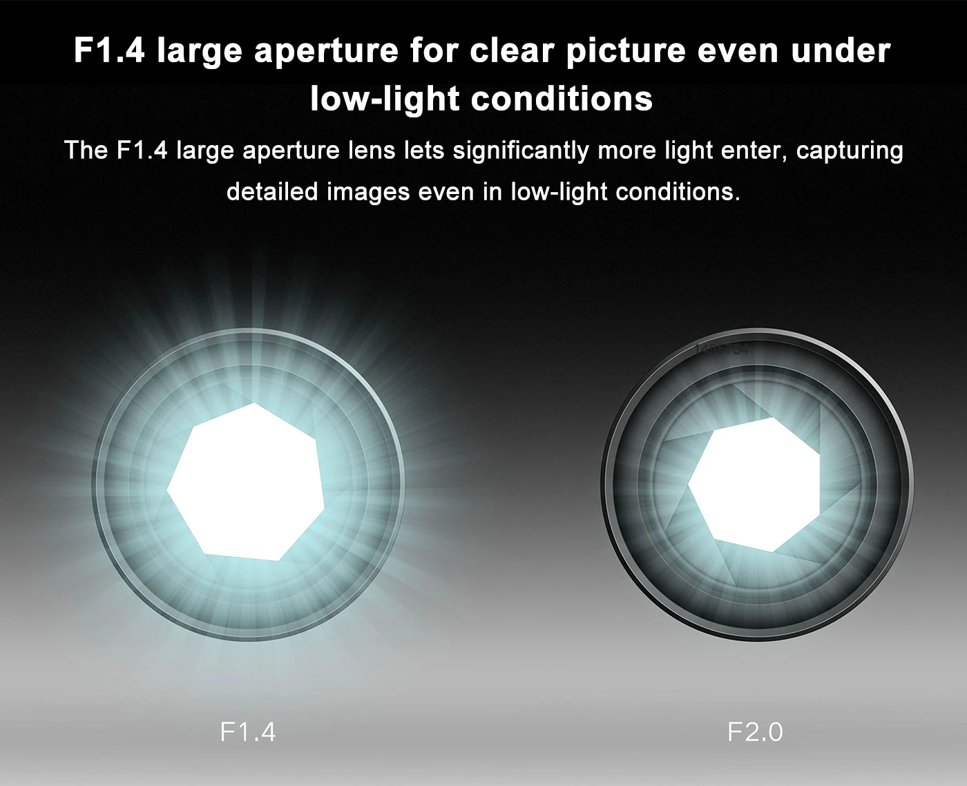 Объектив с большой апертурой F1.4 позволяет значительно больше светильник, захватывая детальные изображения даже в условиях низкой светильник.