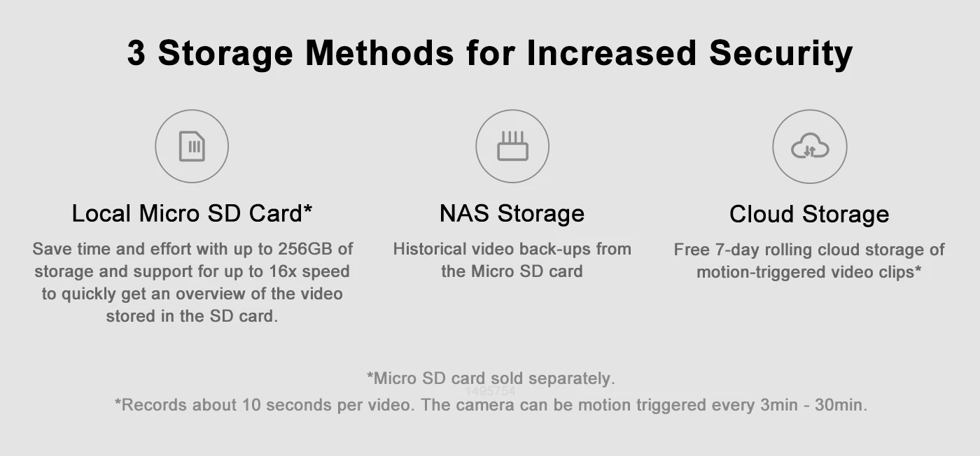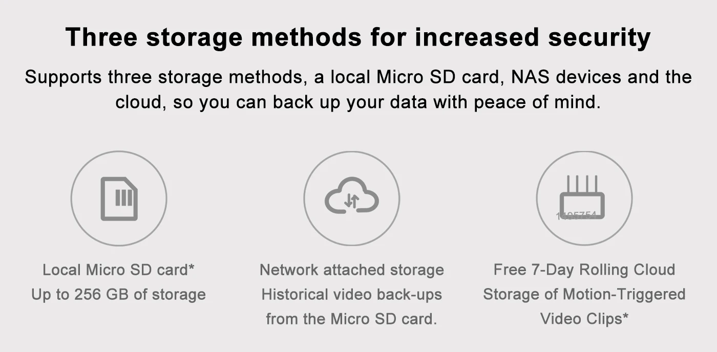 Поддерживает три способа хранения, локальную карту Micro SD, устройства NAS и облако, так что вы можете сохранять свои данные спокойно.