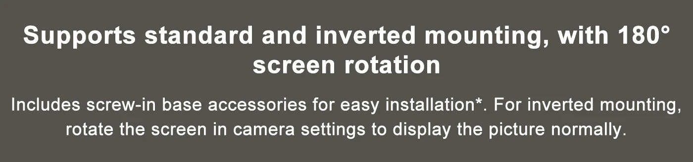 Включает в себя винтовые базовые аксессуары для легкой установки *. Для перевернутого крепления поверните экран в настройках камеры, чтобы нормально отобразить изображение.