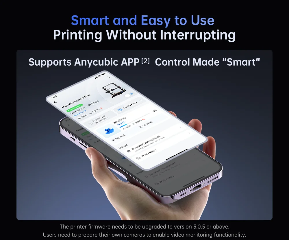 После обновления прошивки принтера до версии 3.0.5 или выше приложение Anycubic предлагает поддержку различных функций, включая онлайн-поиск в библиотеке моделей, видеонаблюдение и мониторинг состояния в реальном времени, онлайн-нарезку и печать, покадровая запись, а также дистанционное управление и управление.