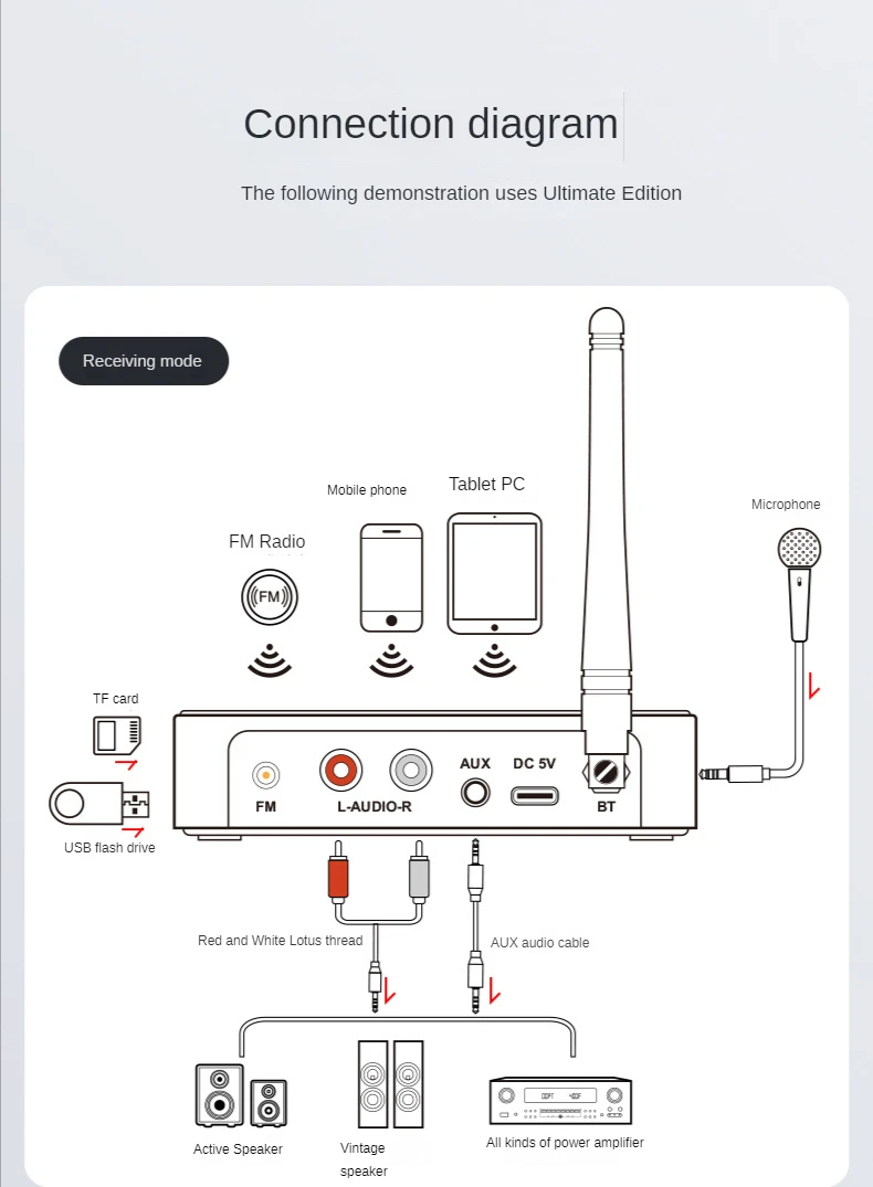 ◆ Поддержка различных операций, таких как Внешний пульт дистанционного управления в частном режиме 5-8 м красного цвета, режим/сигнал/громкость/вверх/вниз/микширование/микрофон и т. Д.