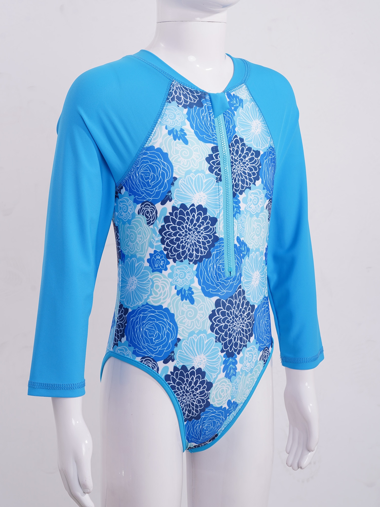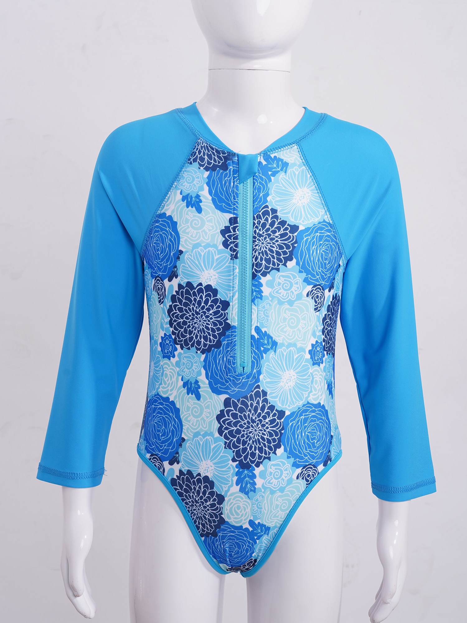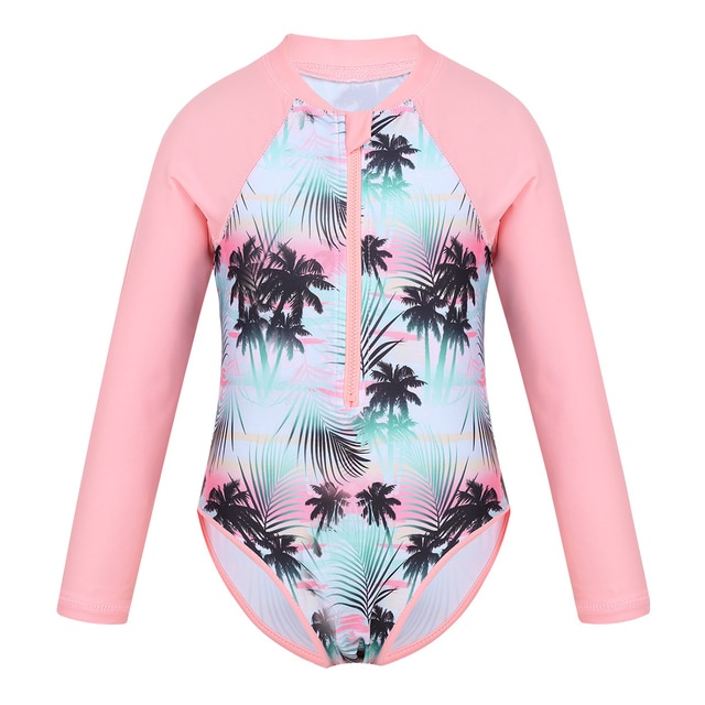 Новинка 2023, Цельный купальник для девочек с длинным рукавом, Модный Купальник на молнии с пальмовым принтом, детское летнее бикини, купальный костюм