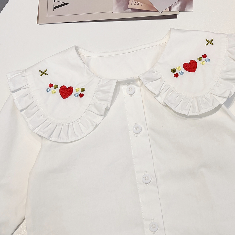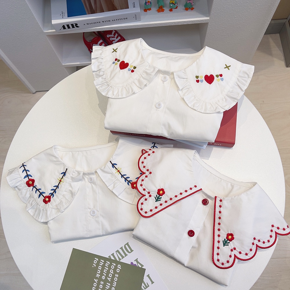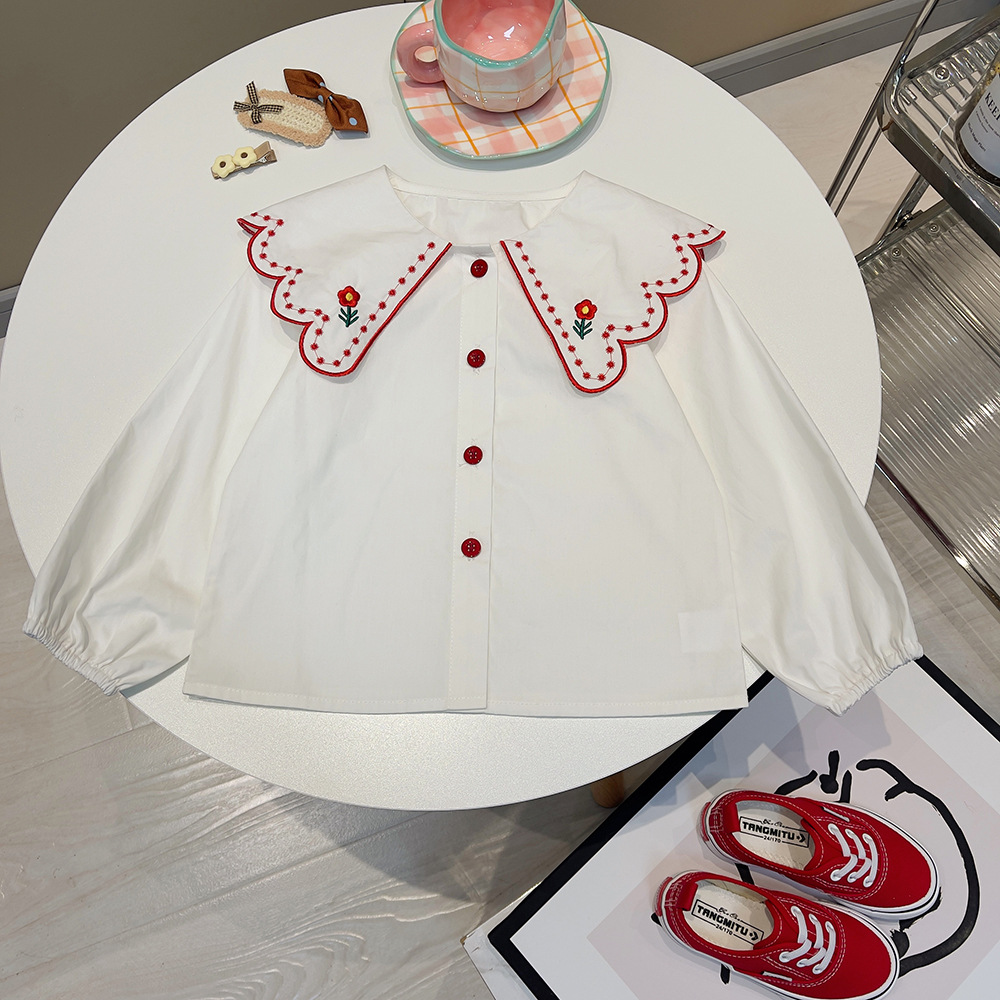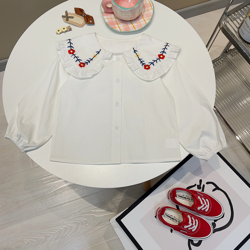 Новинка 2023, весенняя одежда с длинными рукавами для девочек, детская одежда, рубашка с вышивкой и кукольным воротником для маленьких девочек, одежда для маленьких девочек