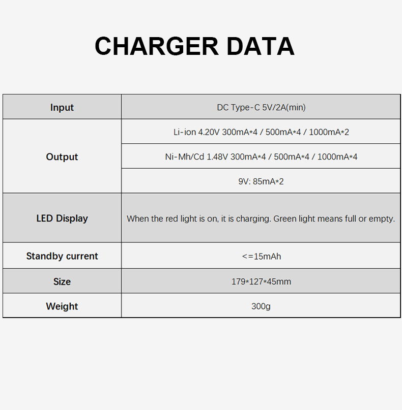 Зарядный ток: 500 мА * 4 USB 5 В выходной ток: 1000 мА Характеристики аккумуляторной батареи: 26650,21700,18650,18350, 20650,14500, AA, AAA, C,SC и т. д. Метод завершения: Интеллектуальный мониторинг напряжения