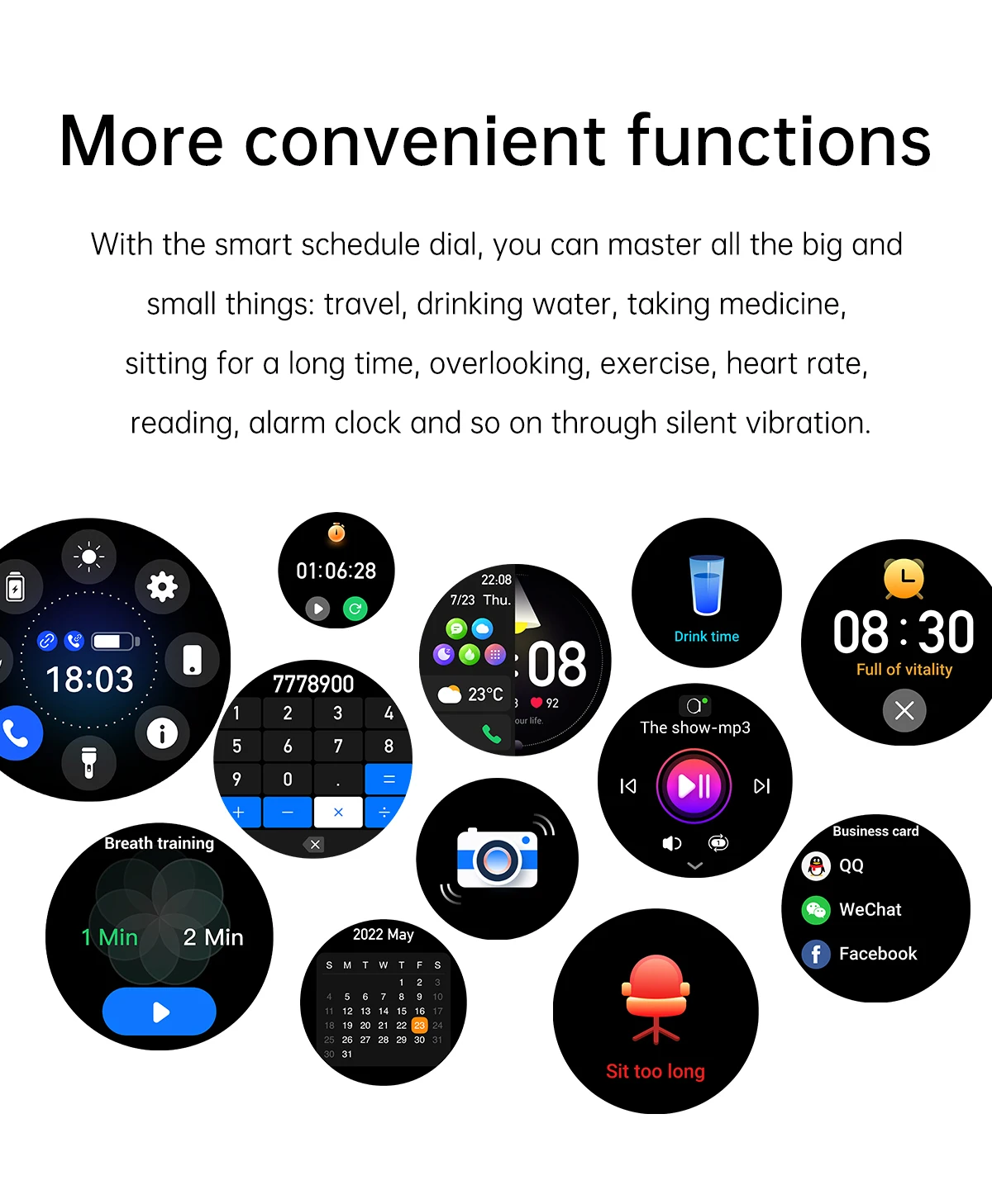 Загрузка массивного набора, загрузка фотографий, подсчет шагов, частота сердечных сокращений, сон, сидячий образ жизни, пробег, кислород в крови, артериальное давление, мобильный поиск, калории, Bluetooth, информация, WeChat, QQ и другие push.
