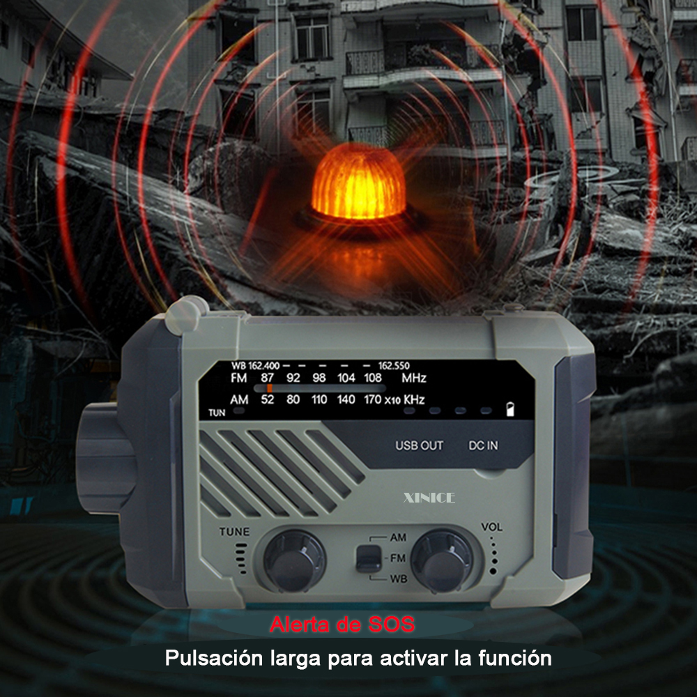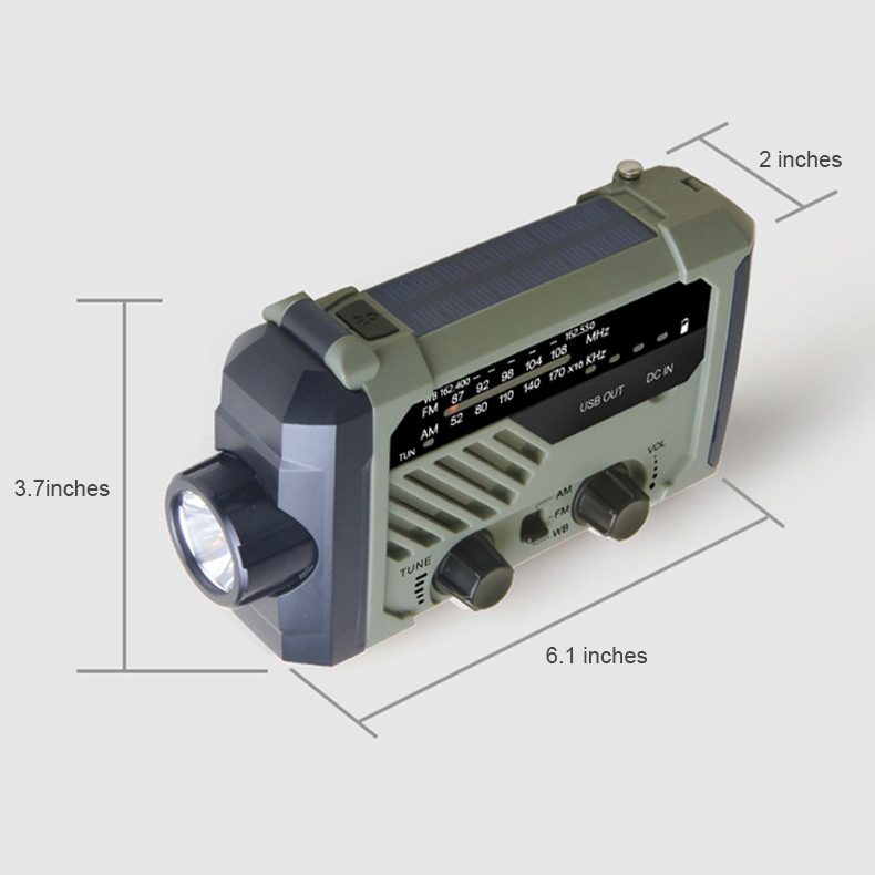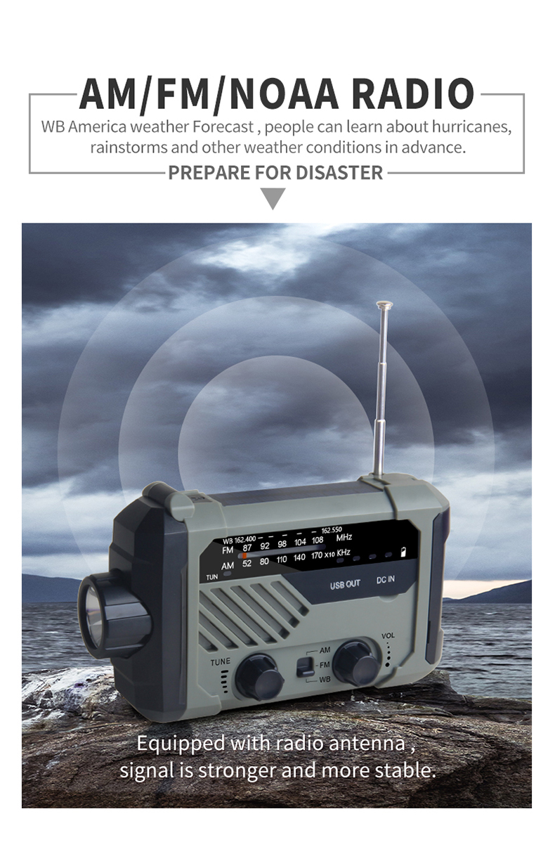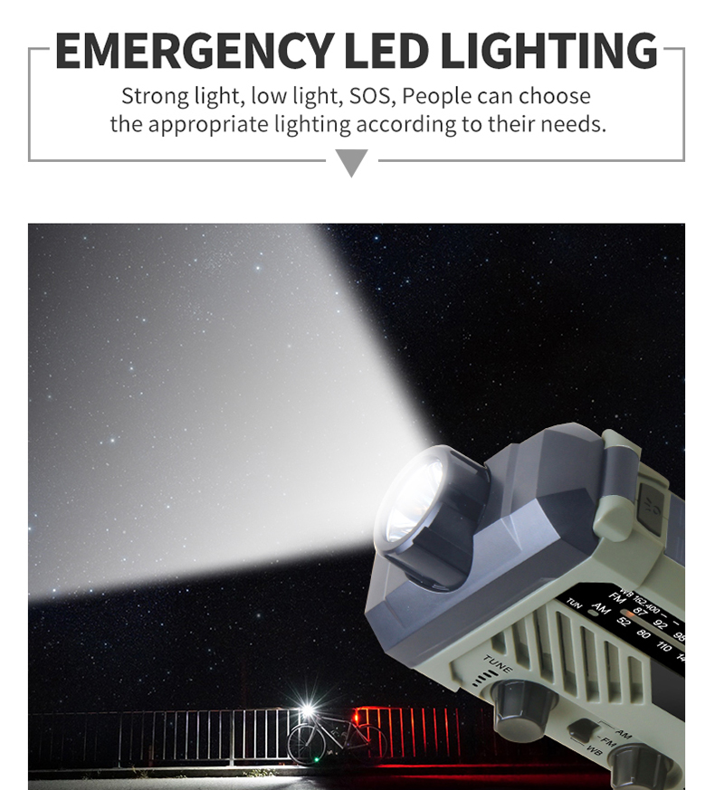 Светодиодный фонарик и сигнал тревоги SOS-Аварийное солнечное радио имеет мощный сверхяркий фонарик мощностью 1 Вт для пеших прогулок, кемпинга или других темных сред. Если вы находитесь в аварийной ситуации на открытом воздухе, вы можете включить помощь по запросу тревоги SOS.
