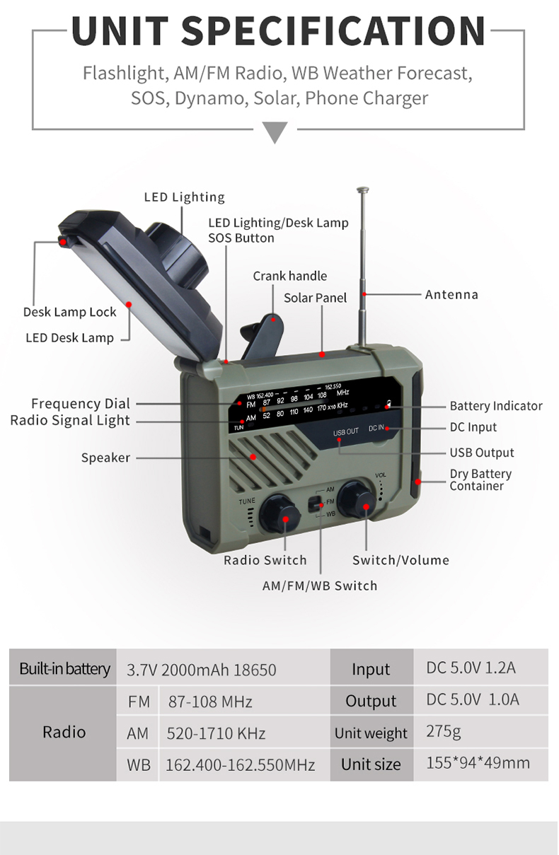 5. Динамик: 0,5 Вт 8 Ом 11. Материал: АБС, ПК 12. Время зарядки: около 6 часов при проворачивании, 20 часов от солнечной батареи, 2 часа от USB (ток зарядки 1200 мАч)