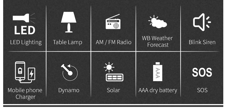 2. Светодиод: 1 шт. Светодиодный фонарик 1 Вт (полусвет: 0,5 Вт 60LM-полный Яркий 1 Вт 120LM-SOS 1 Вт, настольная лампа (полусвет: 0,5 Вт 50LM-полный Яркий 1 Вт 100LM, продолжительность жизни> 10000 ч 3. Время работы белого света (полностью Мощность): высокая яркость (5H), низкая яркость (10H) 4. Радио: AM 520-1700 кГц/FM 87-108 МГц/WB 162400-162550 МГц 5. Сирена:>85 дБ/1 м 6. Время работы радио (полная мощность):10 ч. 7. Время работы сирены (полная мощность):6 часов
